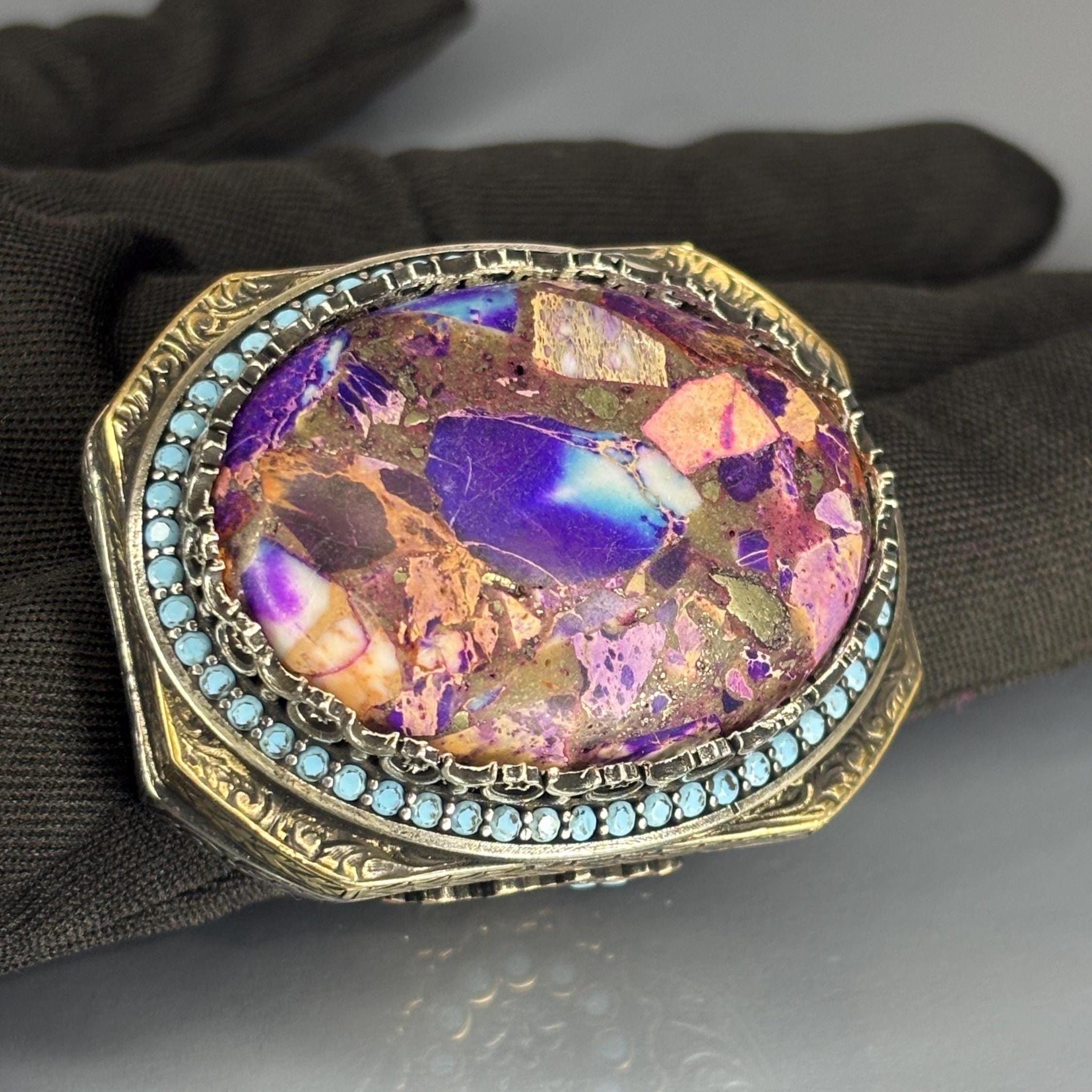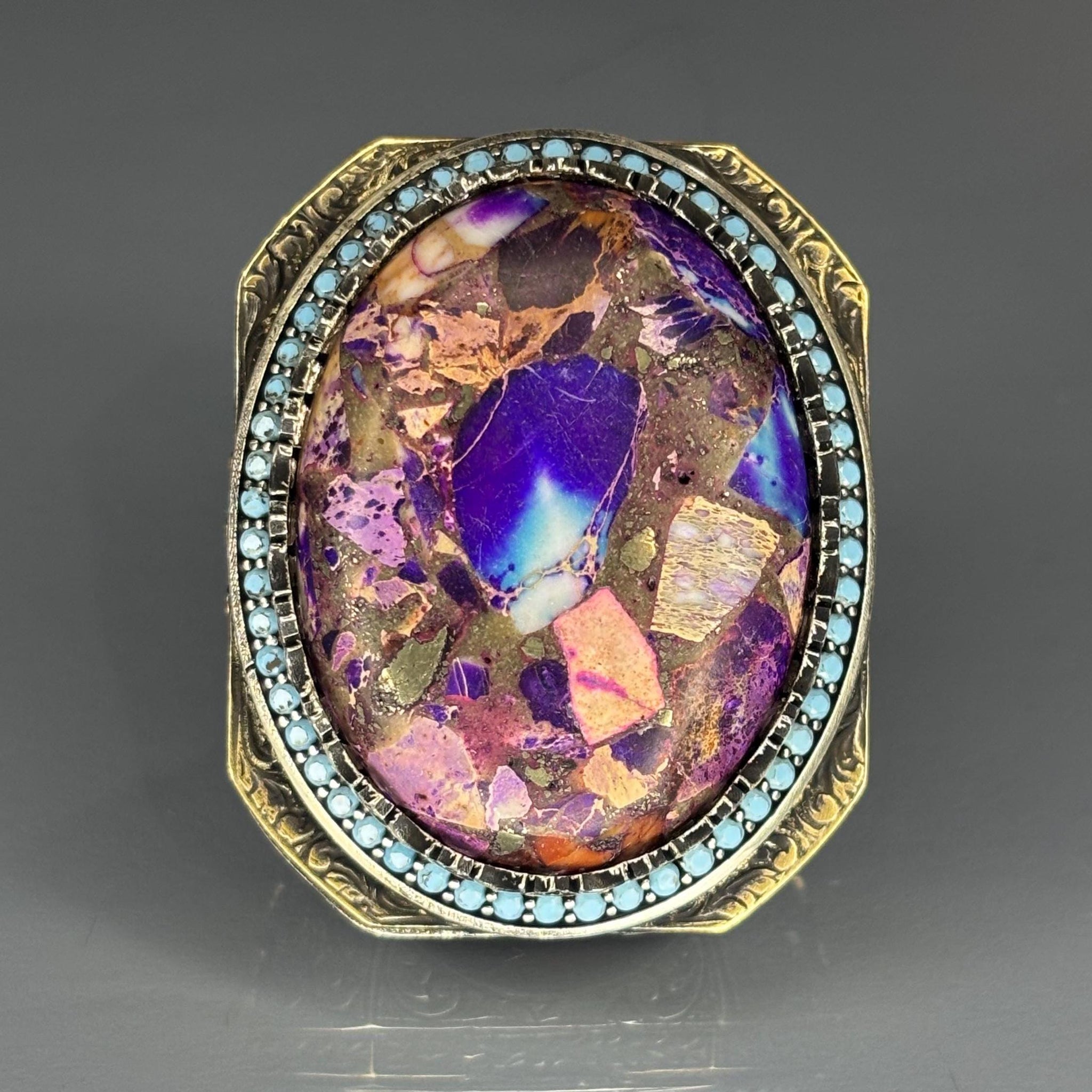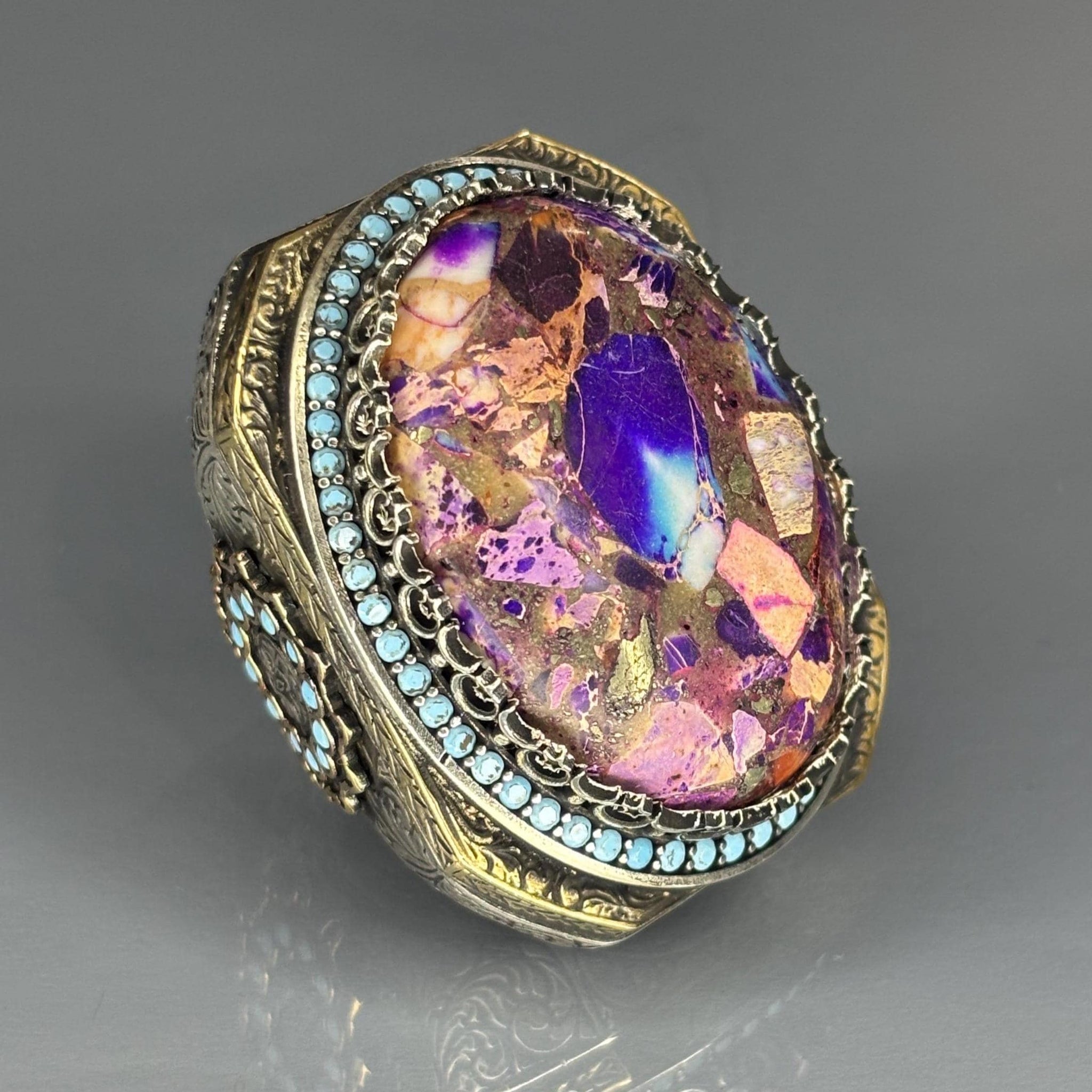 This vibrant men’s ring is crafted from solid 925 sterling silver and showcases a large oval amethyst mosaic stone bursting with purple, copper, and pink tones. Surrounded by turquoise accents and intricate engravings, this handcrafted piece is a striking combination of color, craftsmanship, and cultural style.