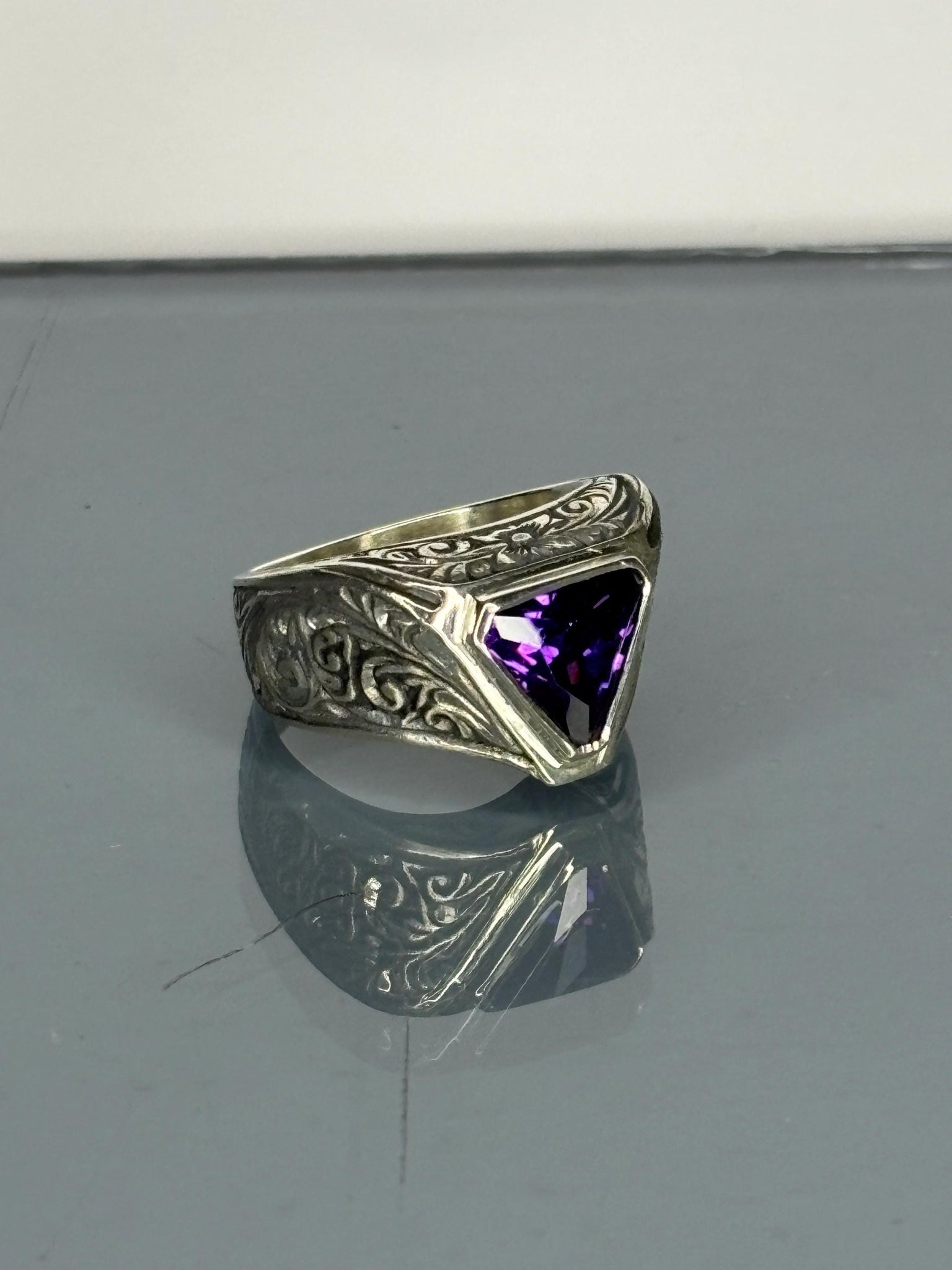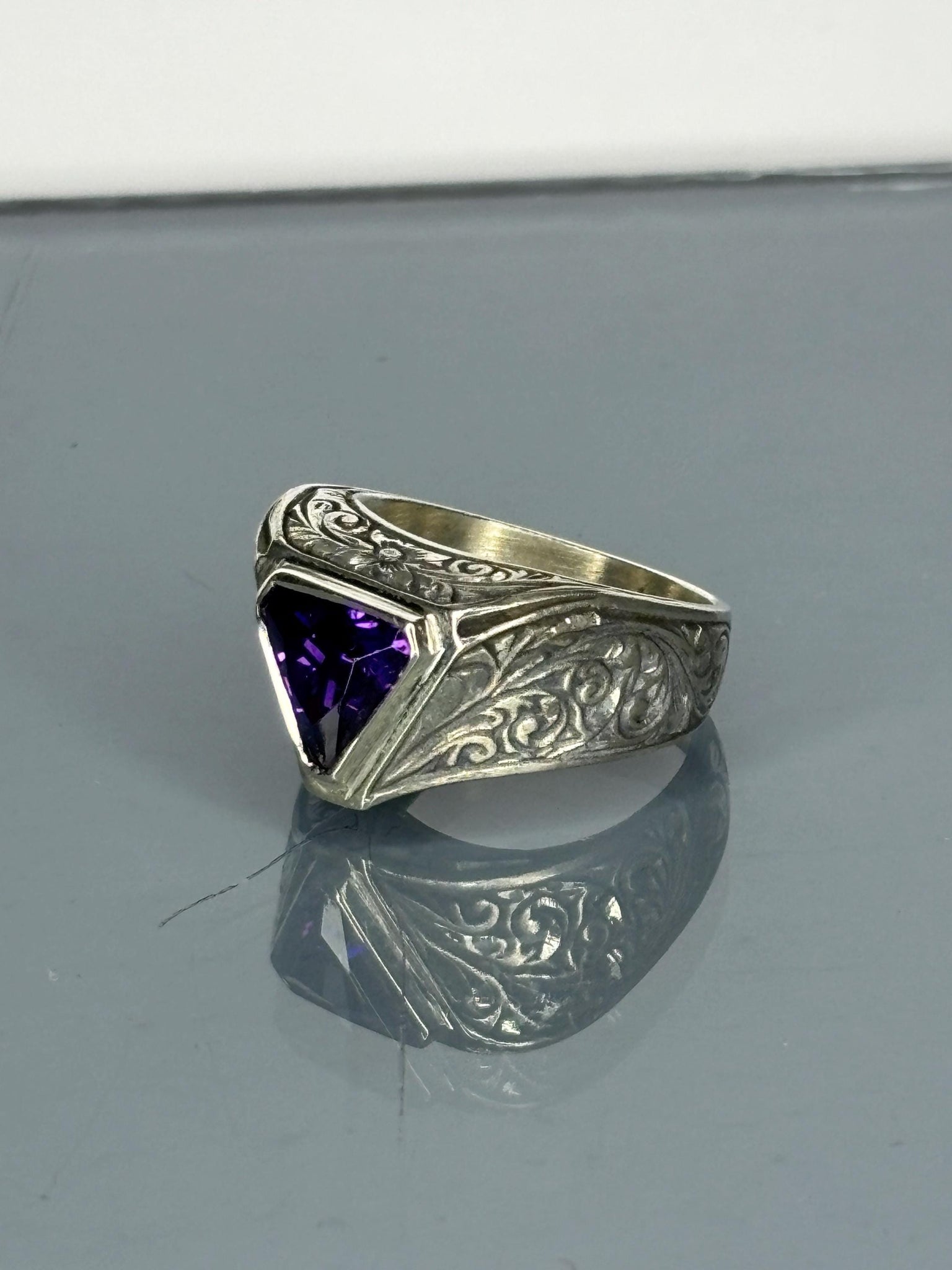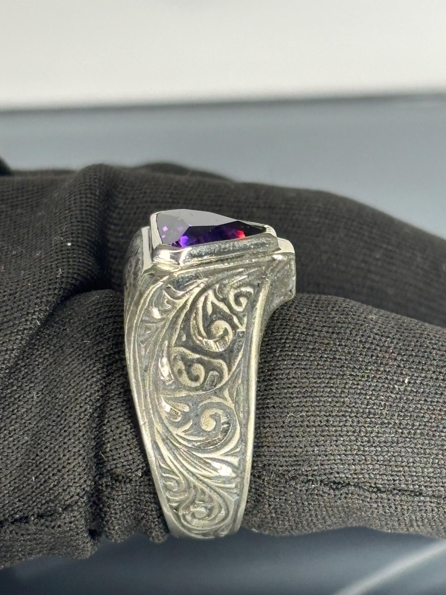This handmade 925 sterling silver men's ring features a striking triangle-cut amethyst gemstone, set in an intricately engraved band. The deep purple hue of the amethyst adds a touch of luxury, while the vintage gothic design gives it a bold and unique aesthetic. A perfect statement ring for men who love distinctive and stylish jewelry!