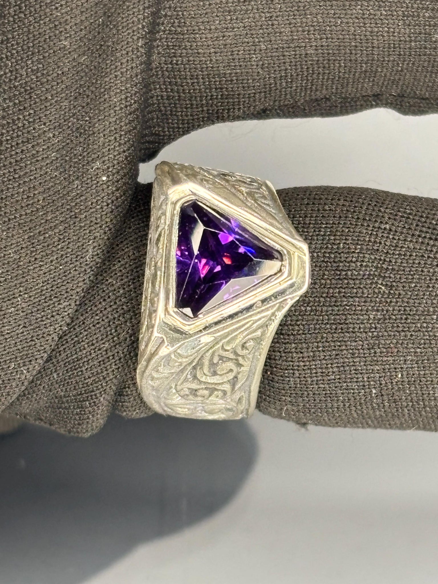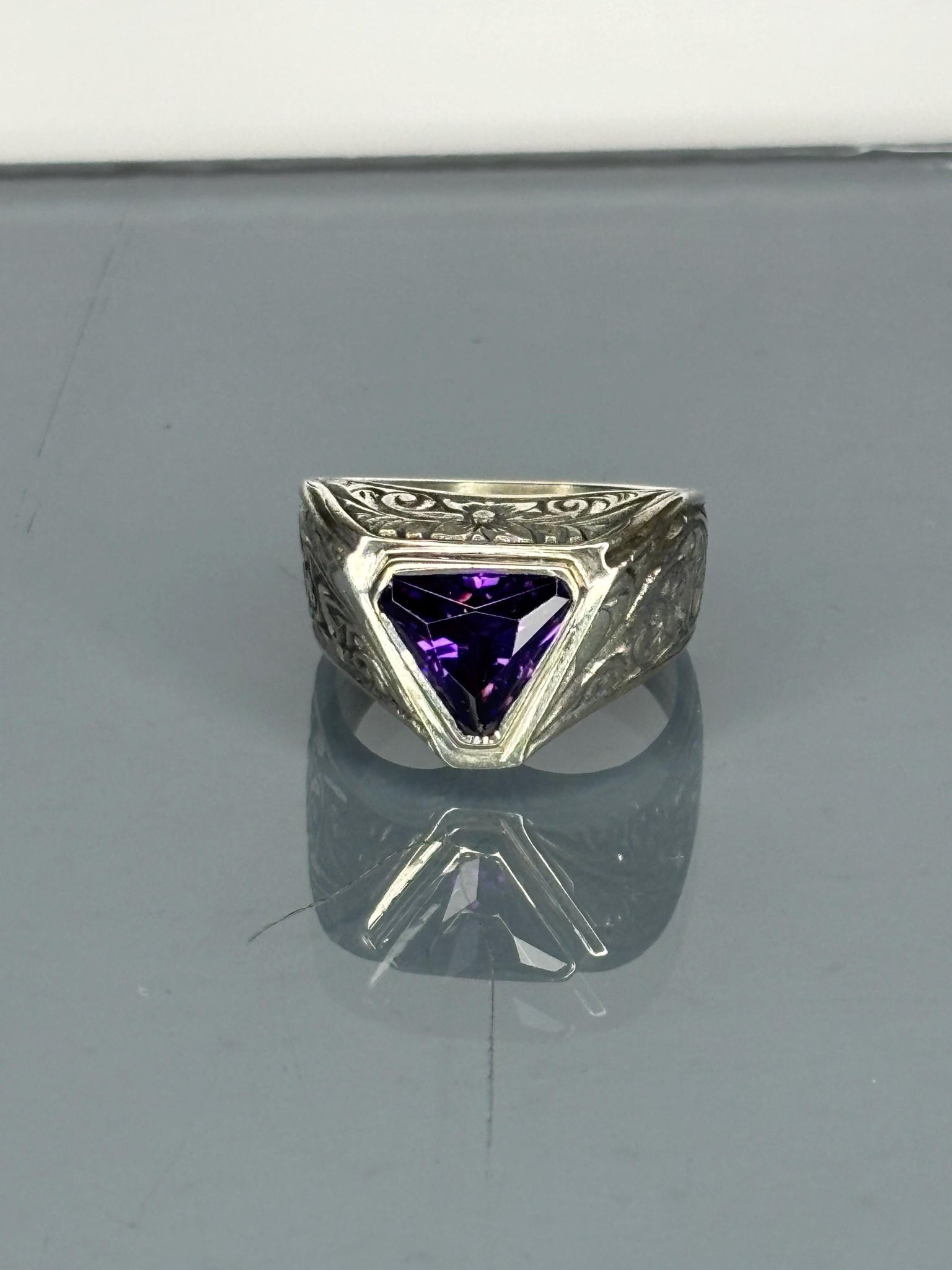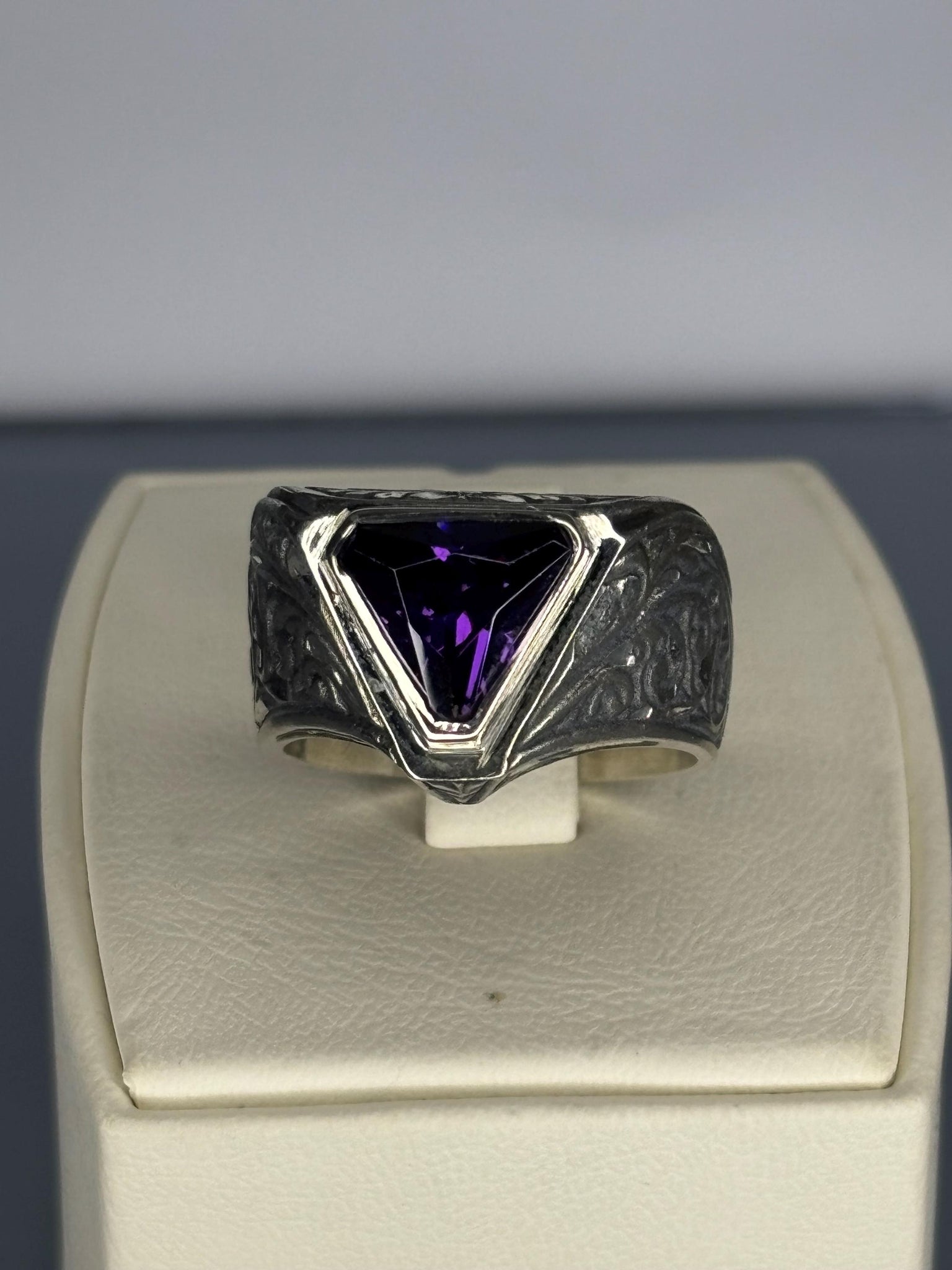 This handmade 925 sterling silver men's ring features a striking triangle-cut amethyst gemstone, set in an intricately engraved band. The deep purple hue of the amethyst adds a touch of luxury, while the vintage gothic design gives it a bold and unique aesthetic. A perfect statement ring for men who love distinctive and stylish jewelry!