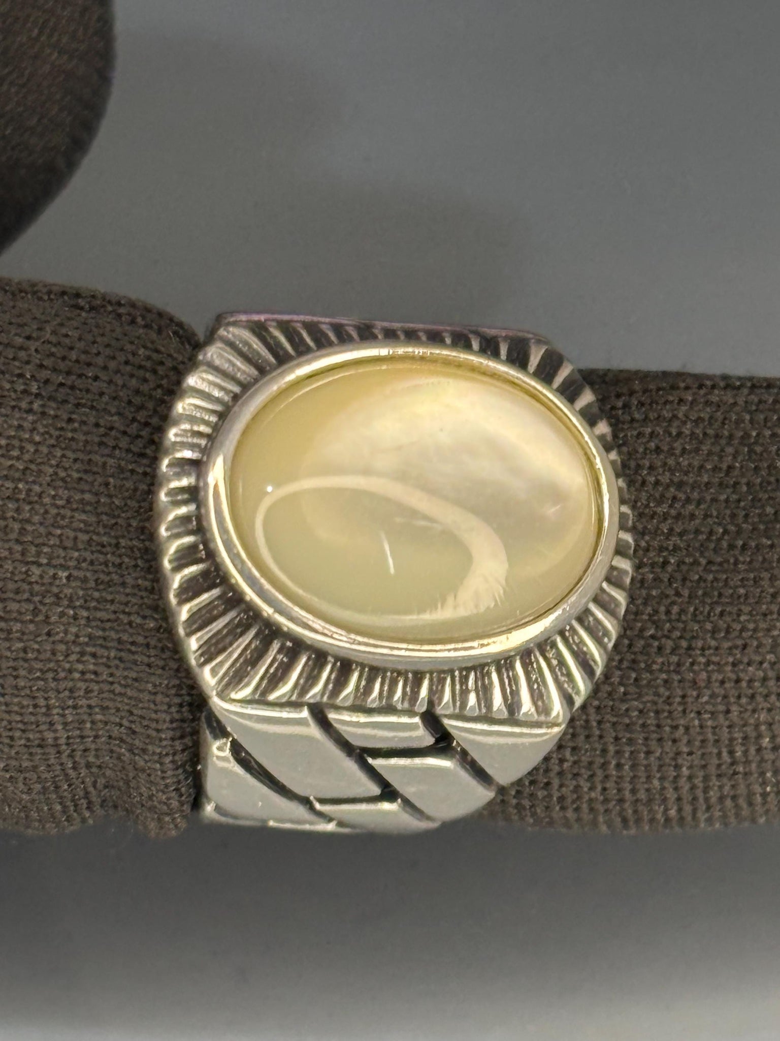 This elegant 925 sterling silver men's ring features a smooth oval pearl stone set in a bold braided chain-style band. Perfectly blending timeless elegance with masculine design, this handcrafted piece adds a sophisticated touch to any outfit.