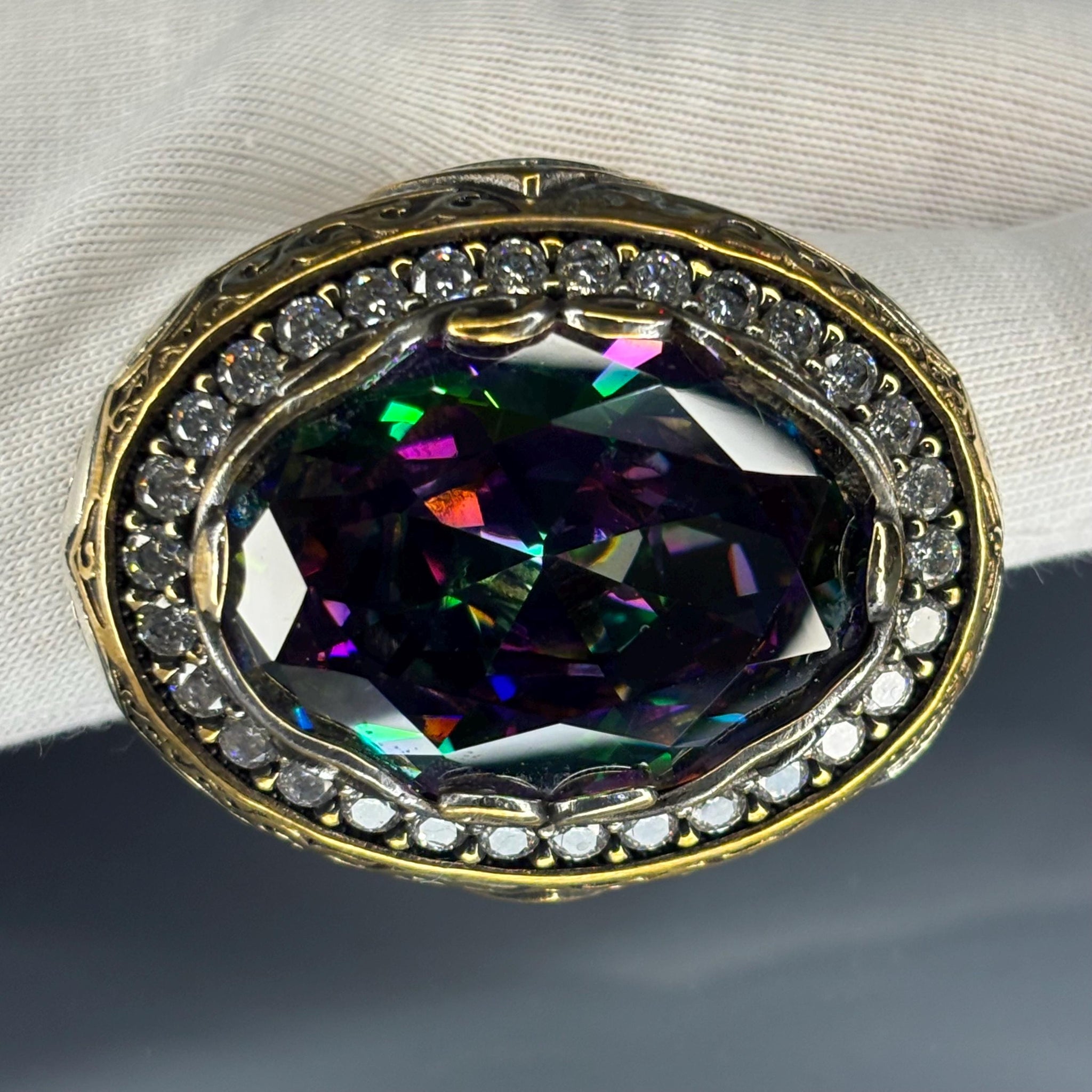 Make a bold statement with this 925 Sterling Silver men’s ring, featuring a mesmerizing oval mystic topaz gemstone that radiates a rainbow of colors. Surrounded by brilliant moissanite stones and framed in a gothic, vintage-style setting, this ring is the perfect combination of power and elegance. 🌈💎