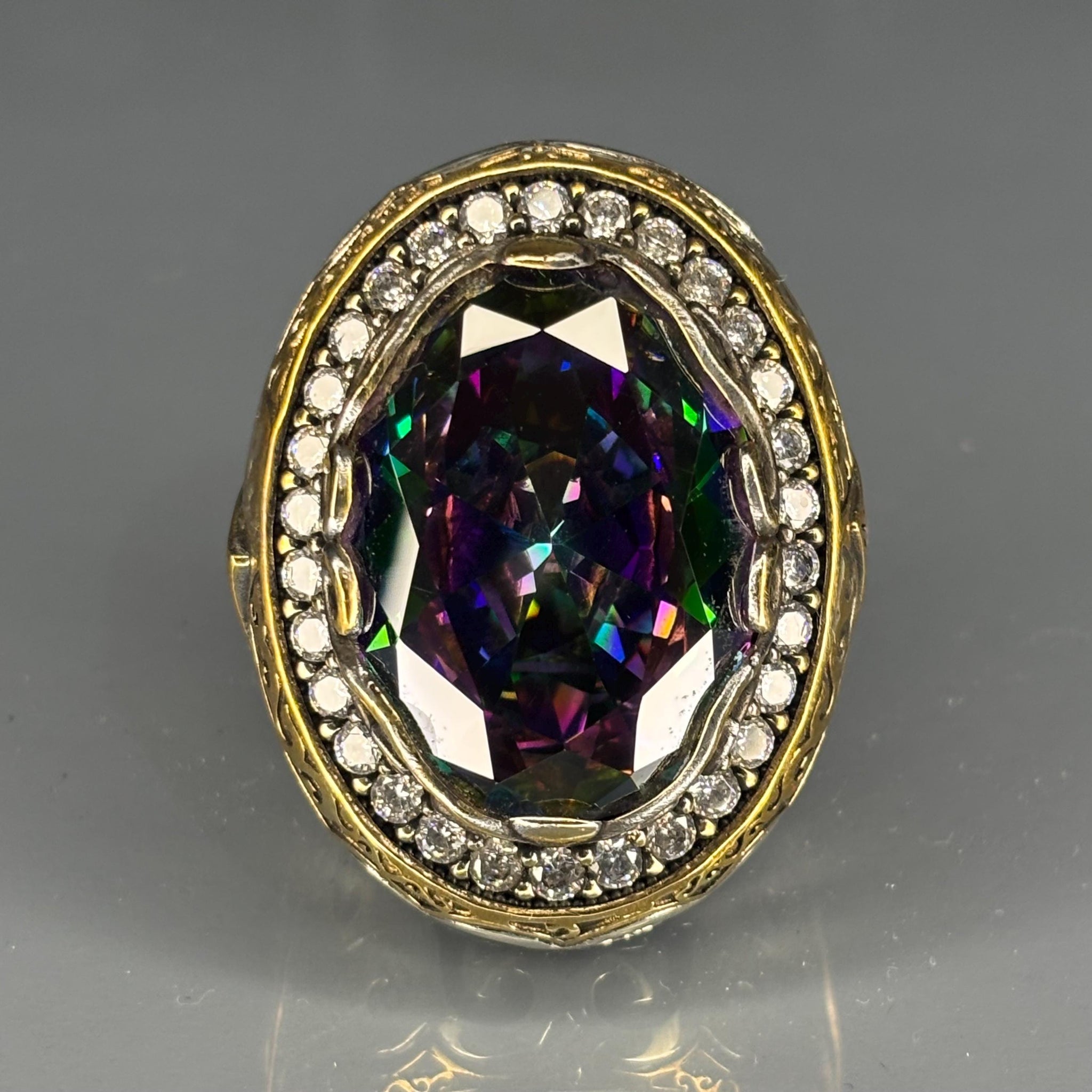 🌈 Main Stone: Oval-cut mystic topaz gemstone with iridescent rainbow flashes that shift in the light