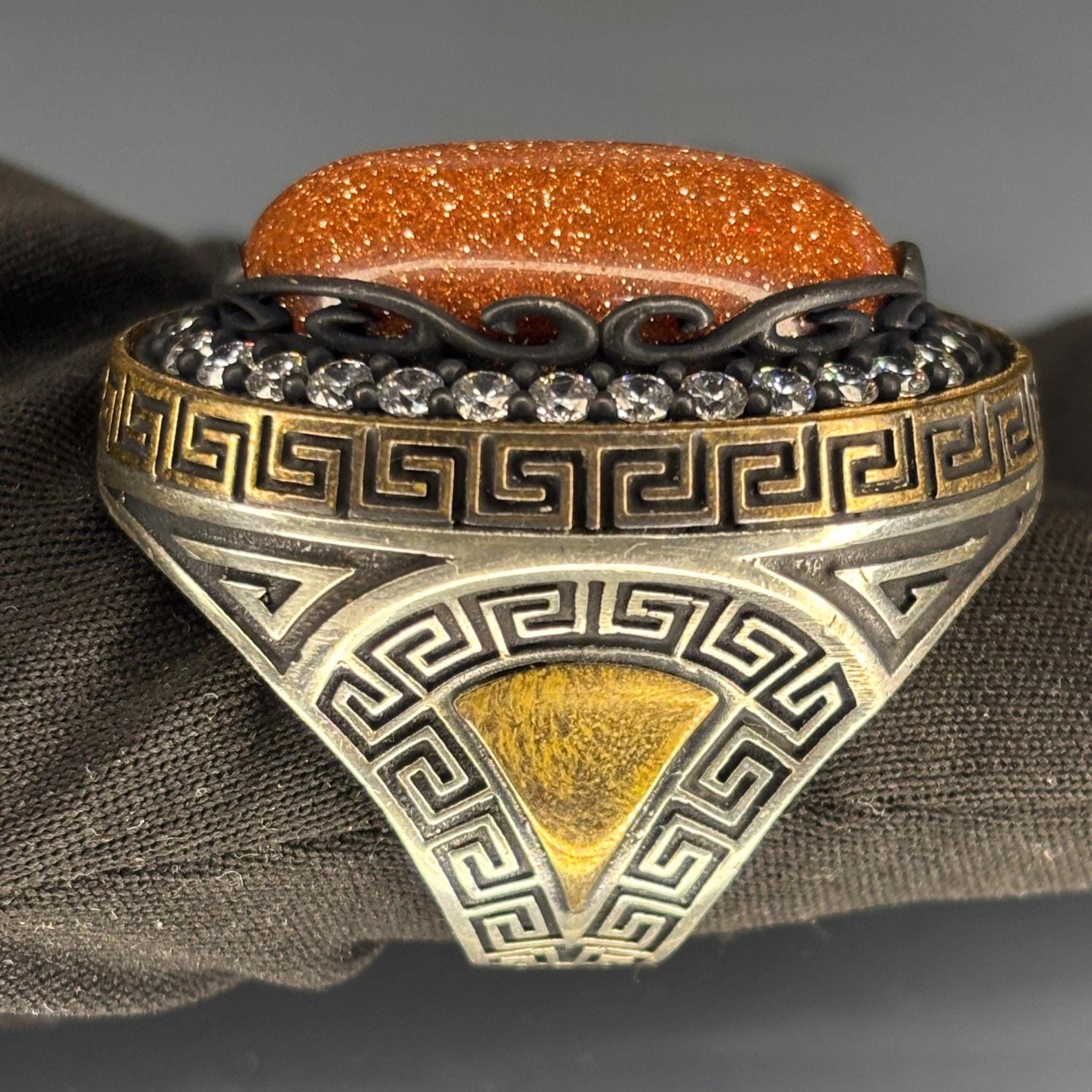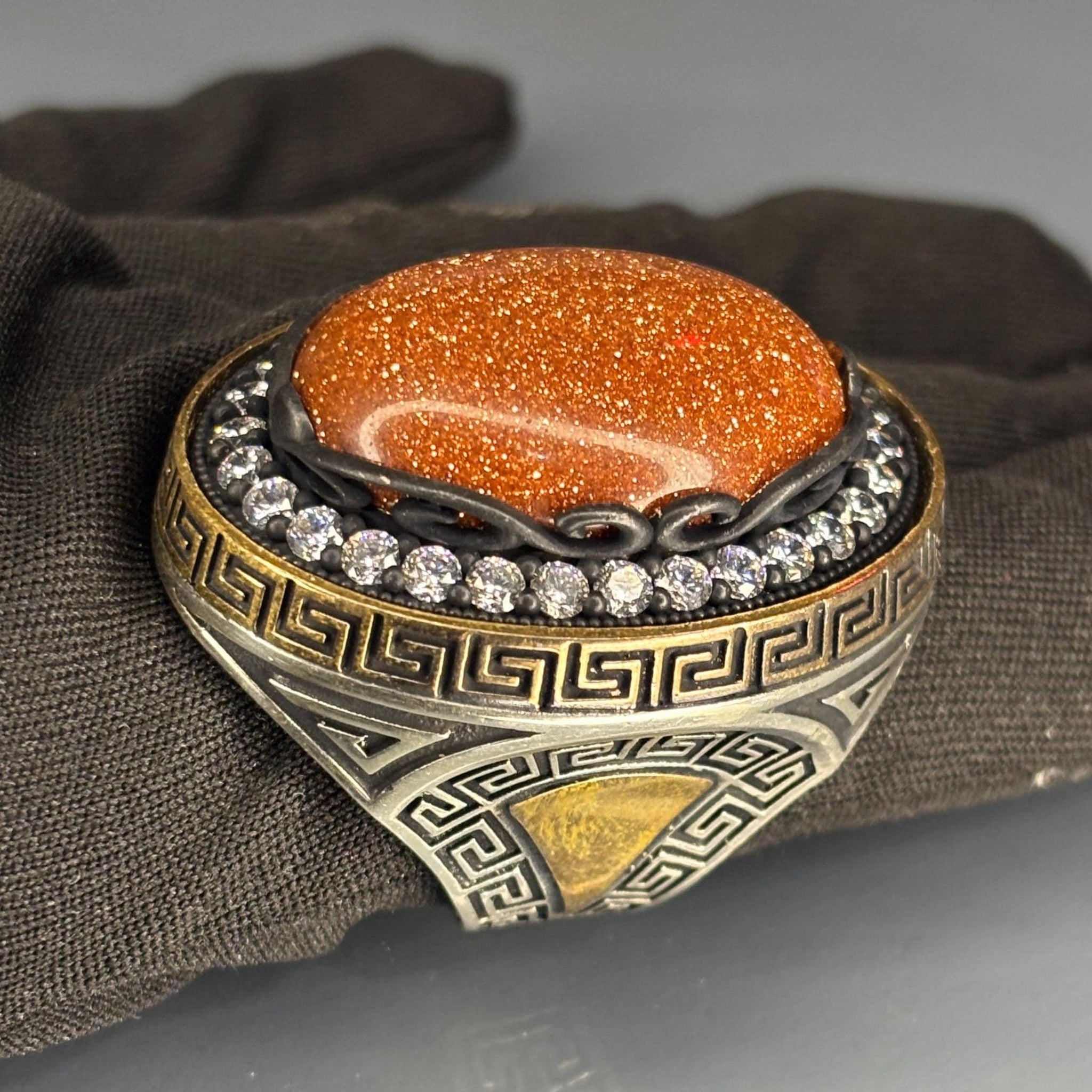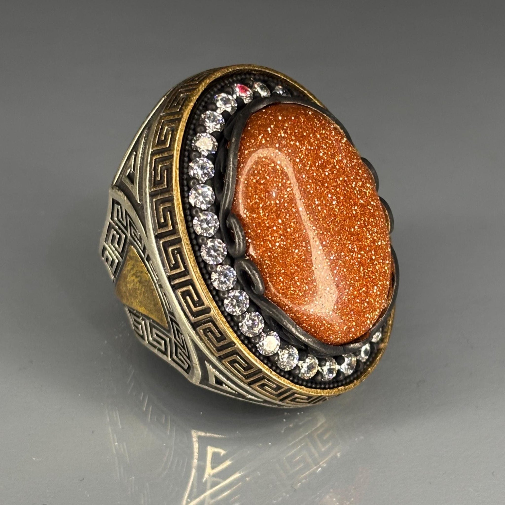 Make a powerful statement with this handcrafted men’s ring featuring a radiant orange aventurine gemstone. Designed in solid 925 sterling silver and adorned with intricate Greek key patterns, this ring blends ancient inspiration with modern craftsmanship for an unforgettable accessory.