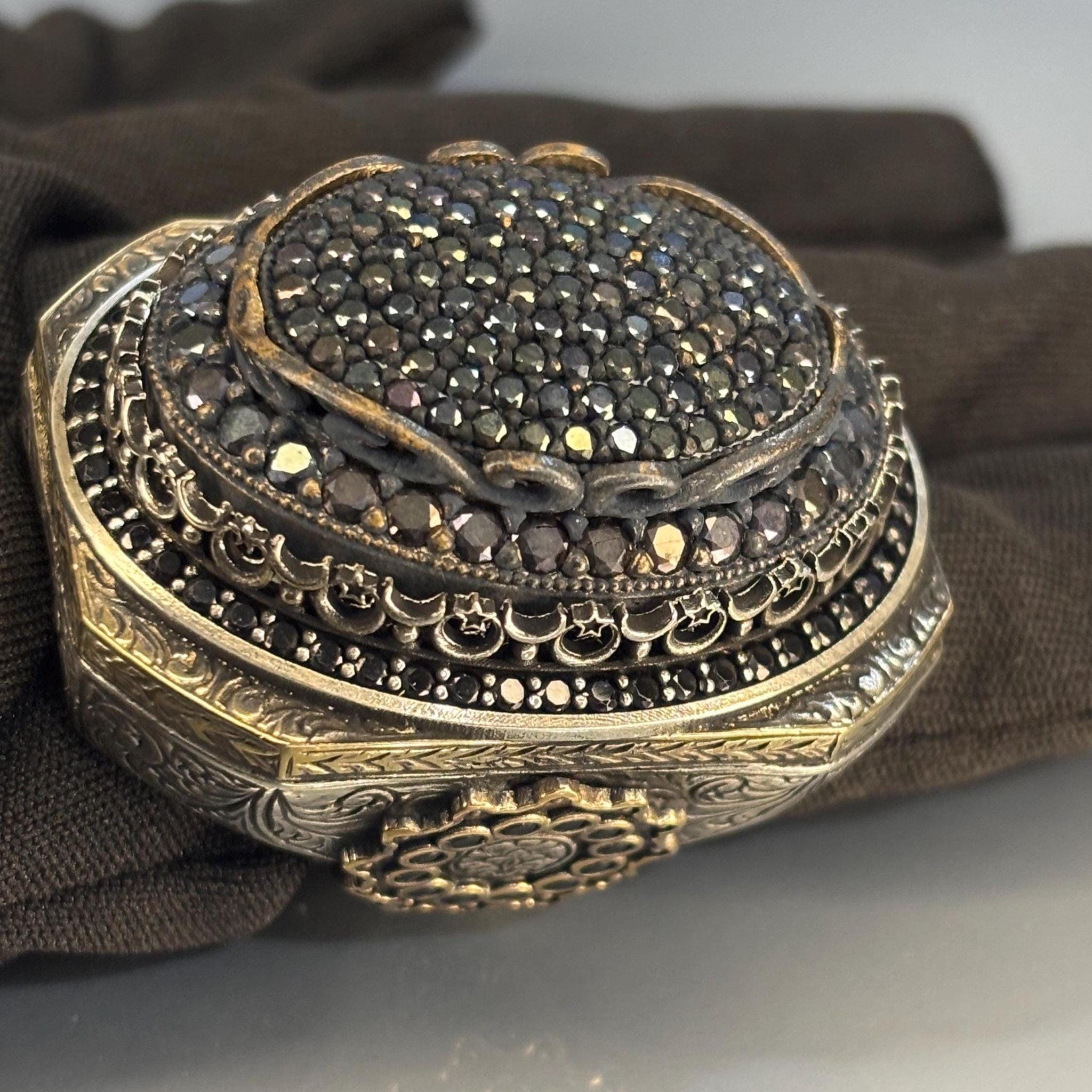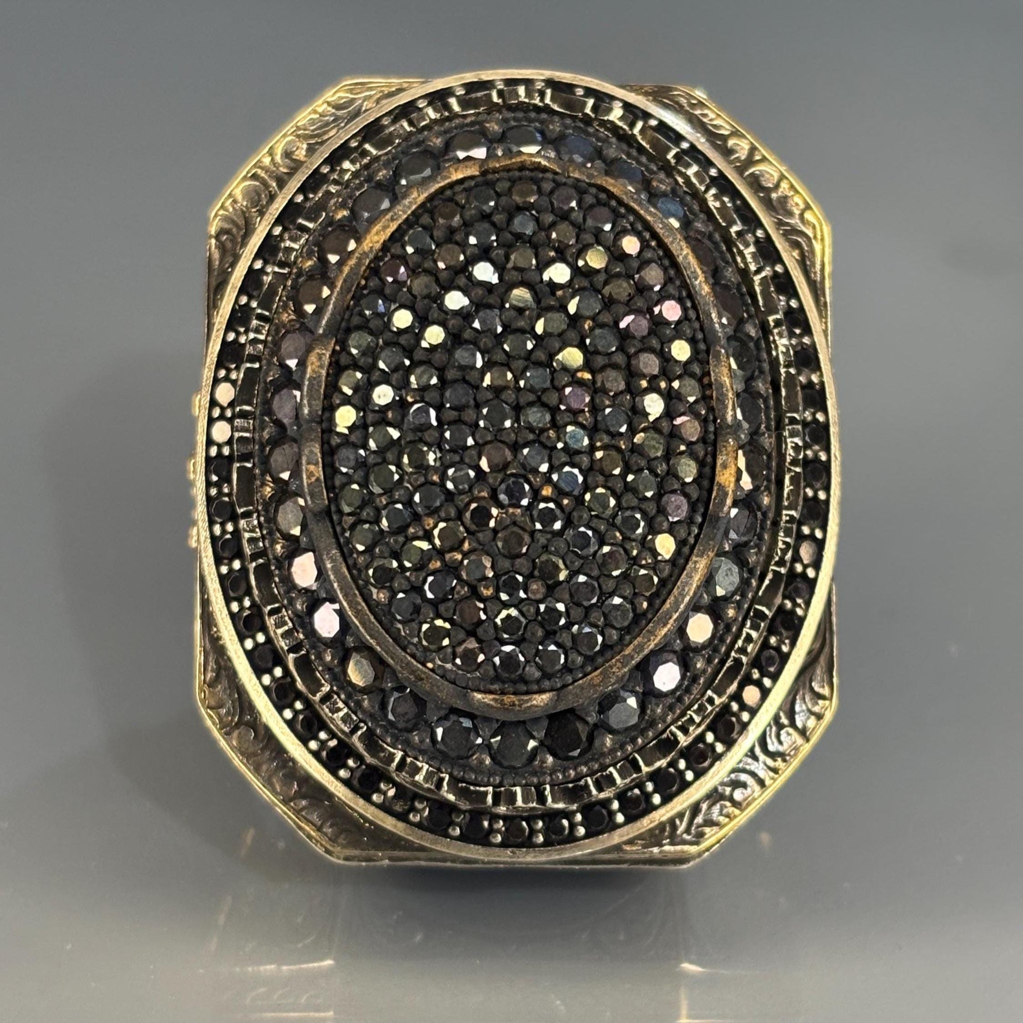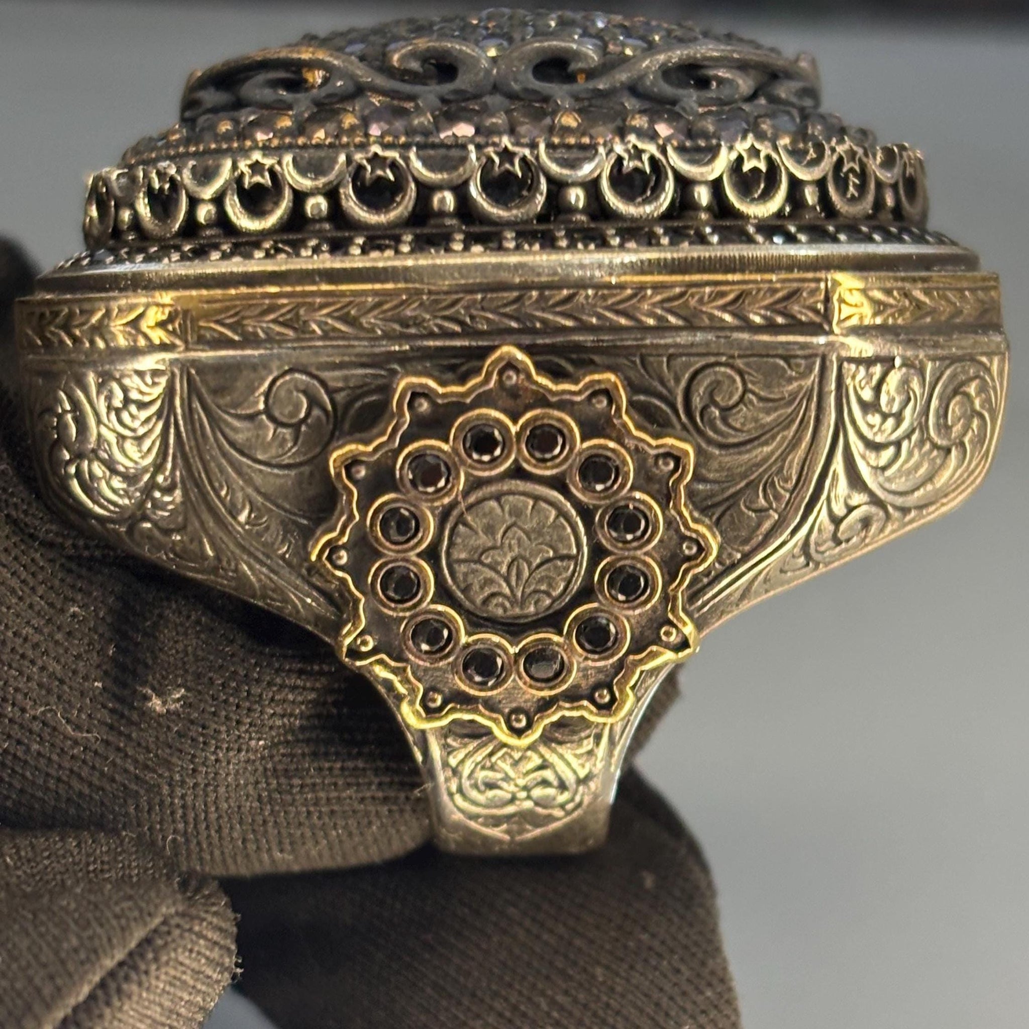 This striking men’s ring is made from solid 925 sterling silver and features a bold pavé-set cluster of black onyx stones. Surrounded by intricate Ottoman-style engravings and antique gold-tone accents, this handcrafted ring is a powerful expression of elegance, strength, and cultural artistry—ideal for men who love detailed, statement-making jewelry.