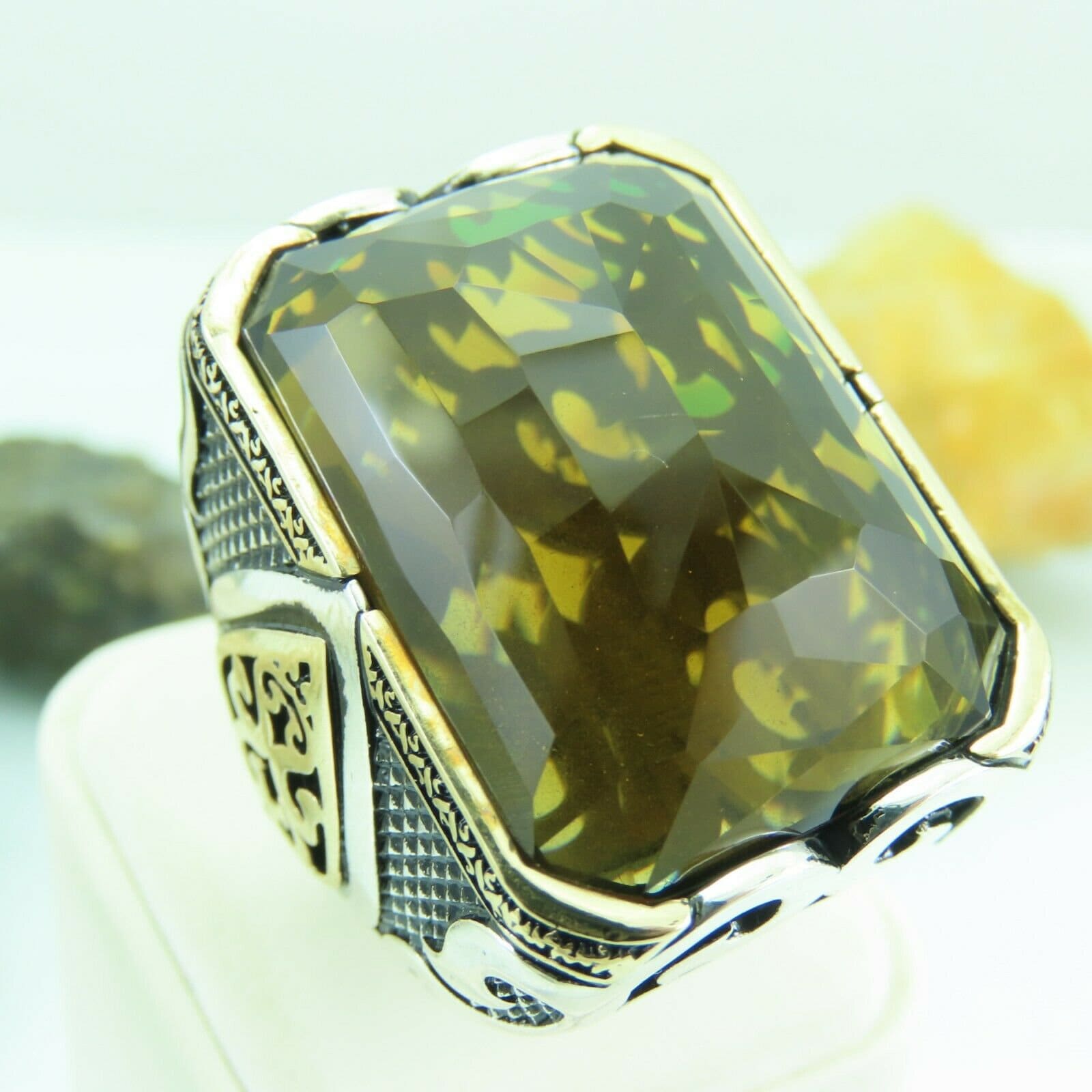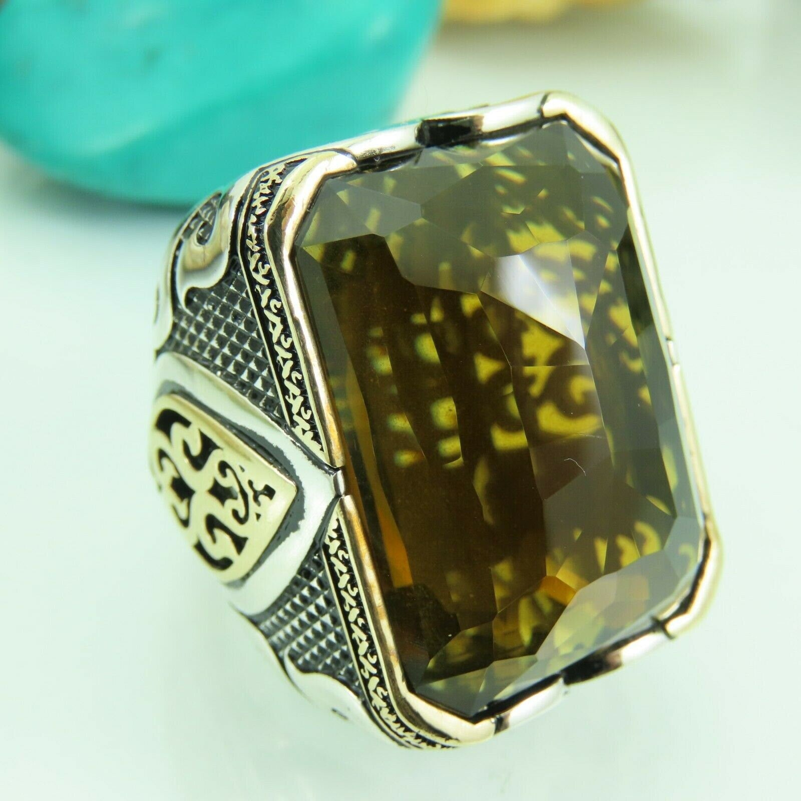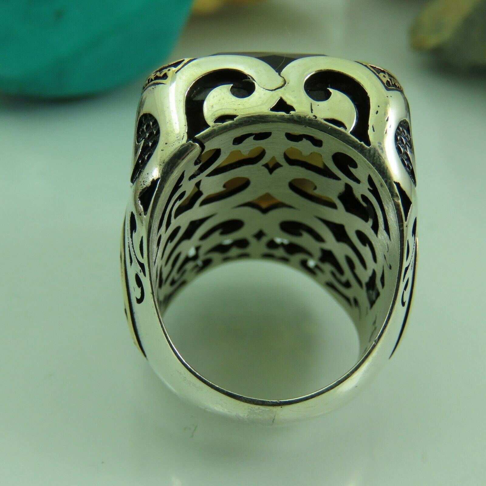 This impressive menโs ring is crafted from solid 925 sterling silver and crowned with a large faceted quartz stone measuring 34x27 mm. The Anatolia-inspired design features ornate engravings and bronze-coated highlights along the shank, blending cultural artistry with modern craftsmanship. Substantial in weight and bold in appearance, this two-tone ring embodies elegance, strength, and heritage.