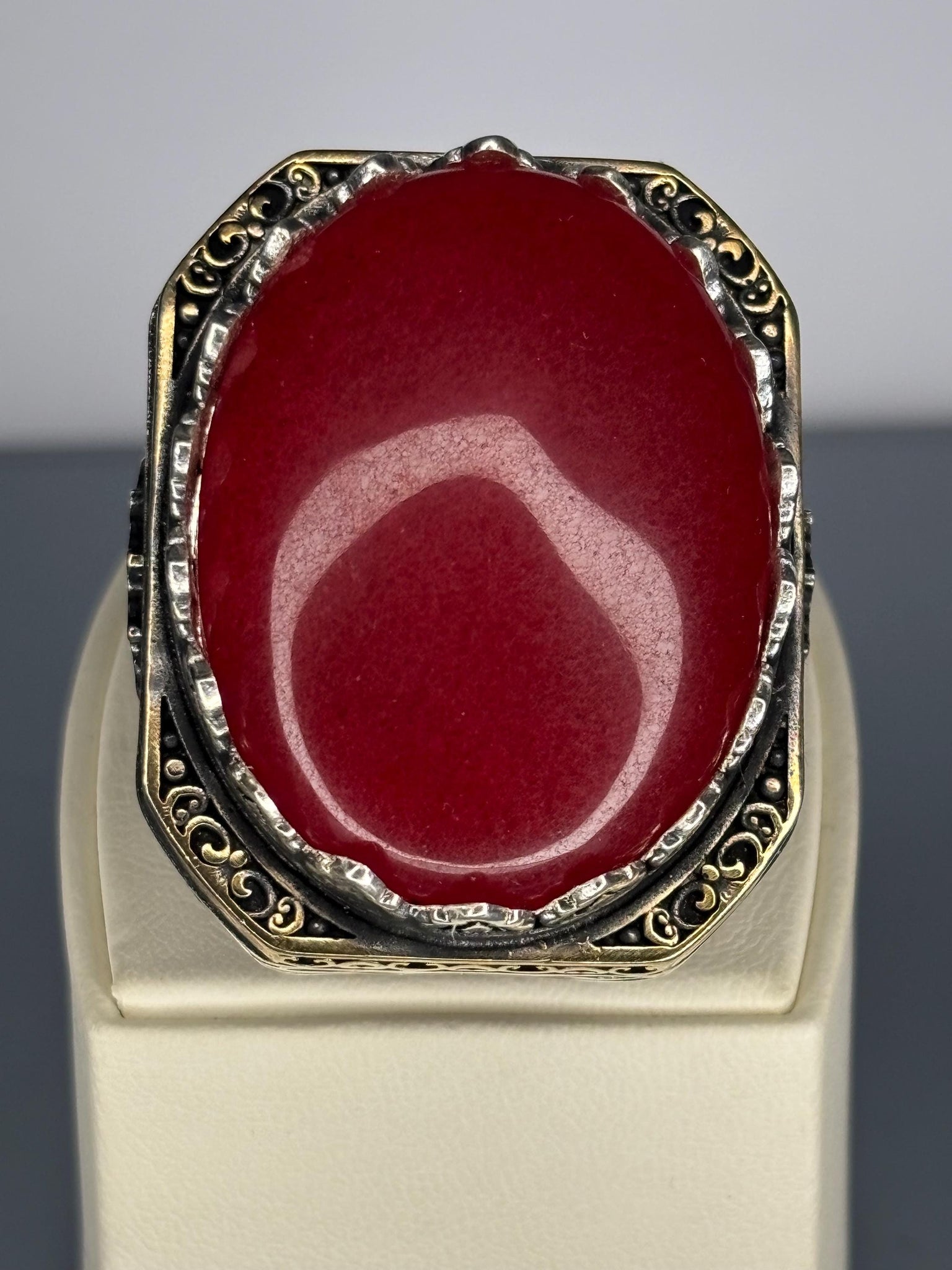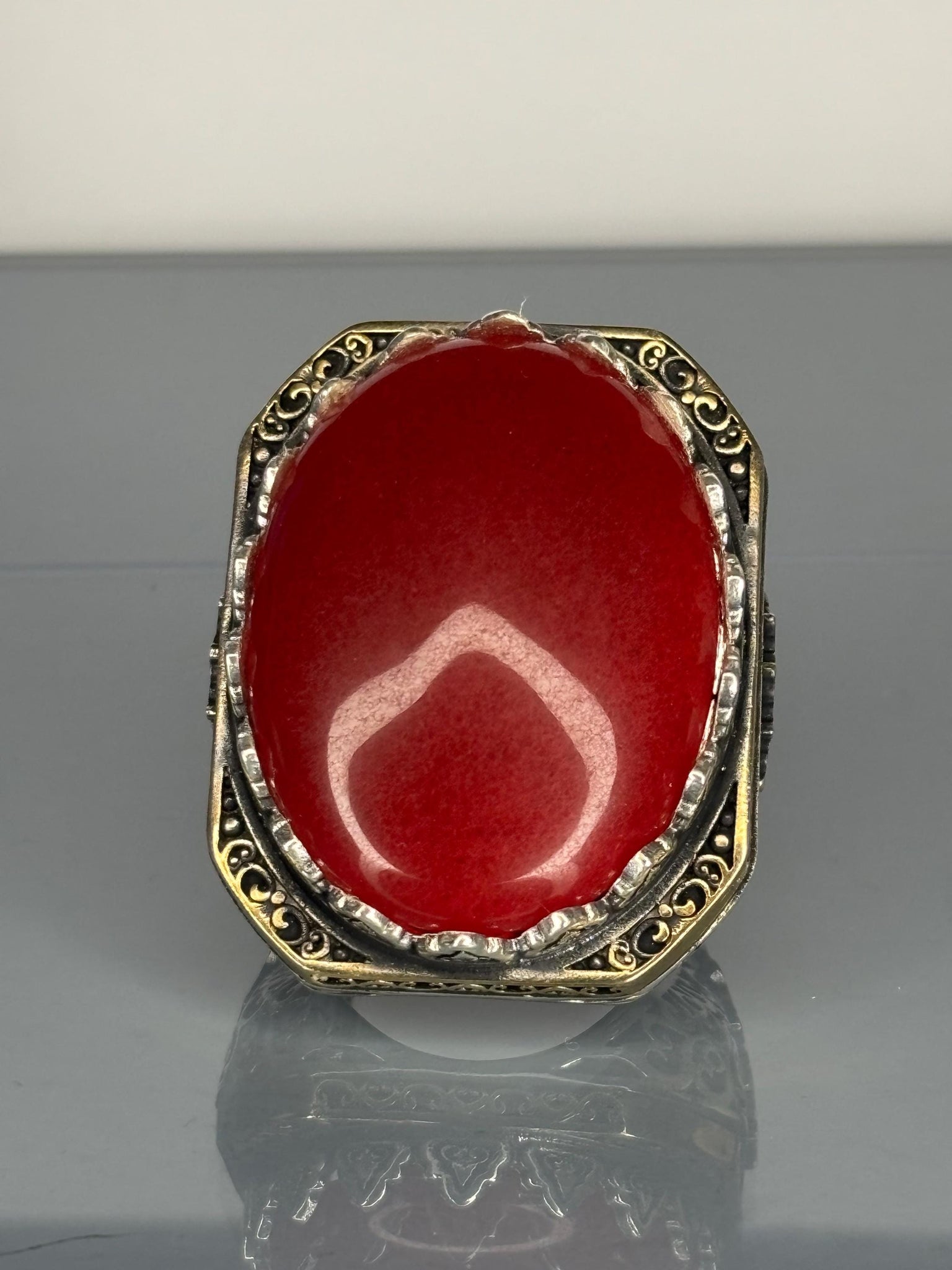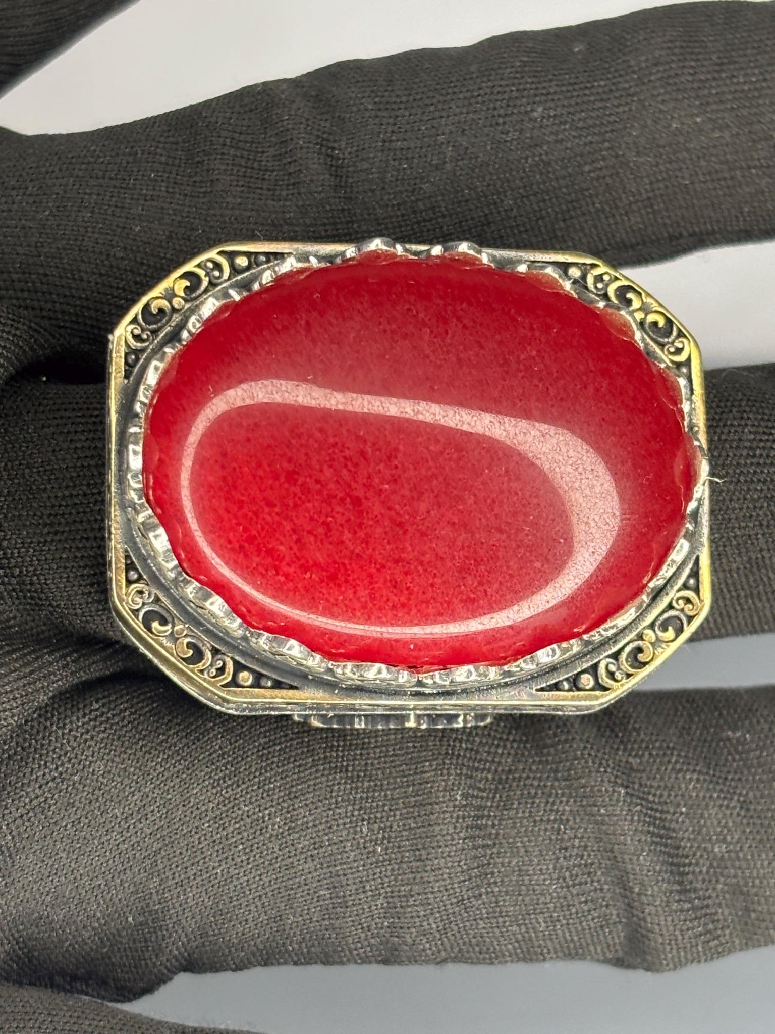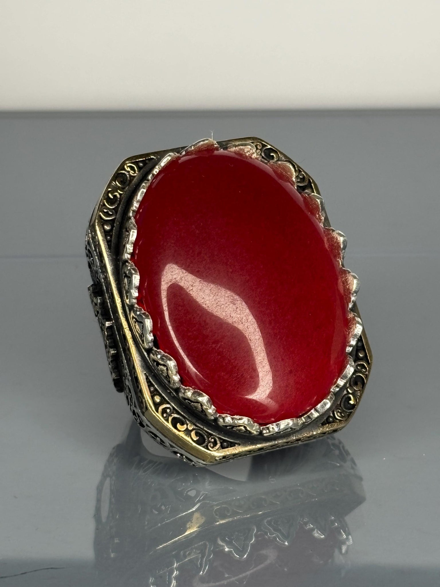 This striking 925 sterling silver men's ring showcases a deep red agate stone set in a detailed vintage-inspired design. A bold statement piece, perfect for everyday wear or as a meaningful gift for him.
