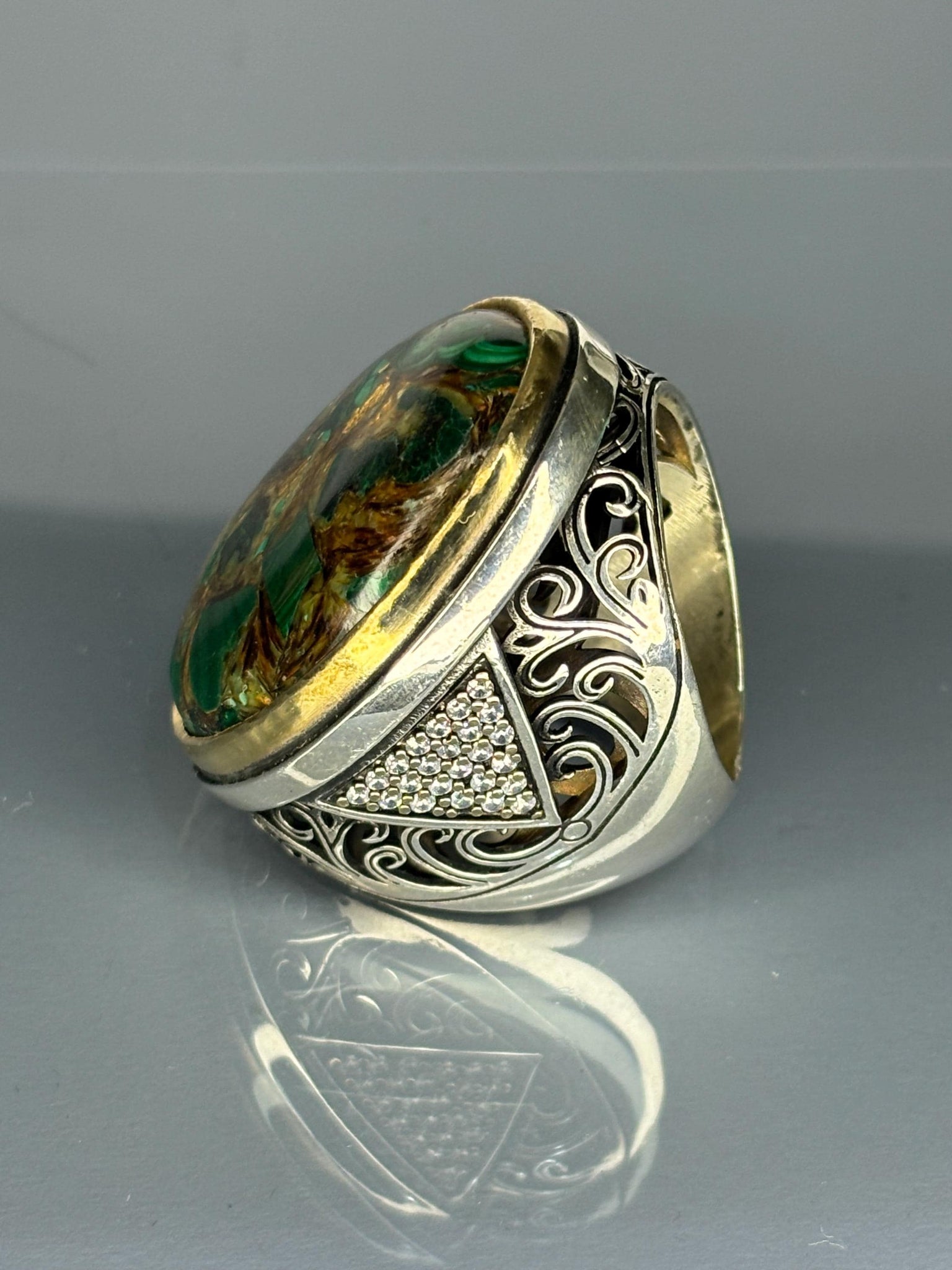 Vintage 925 Sterling Silver Large Men's Ring: Malachite Statement Jewelry, Ottoman Desgin