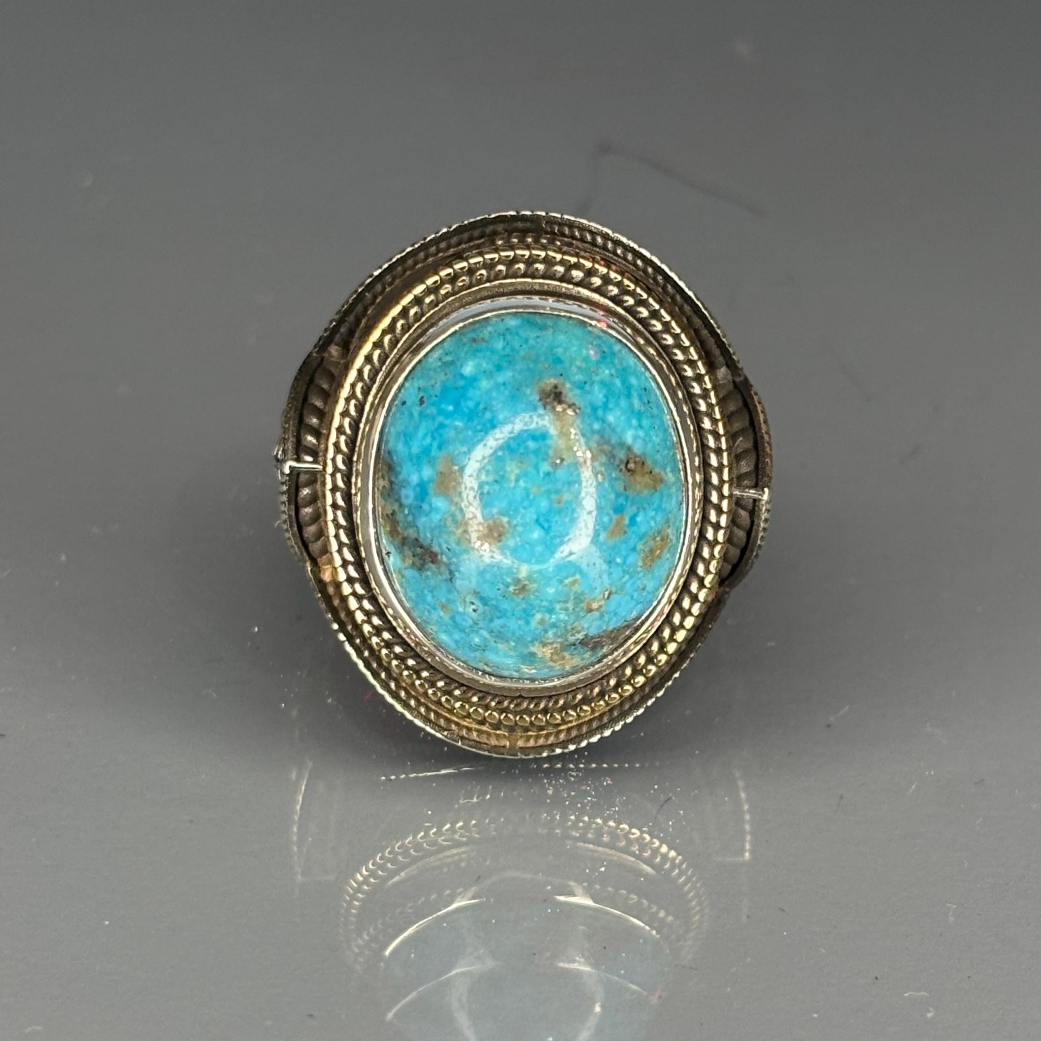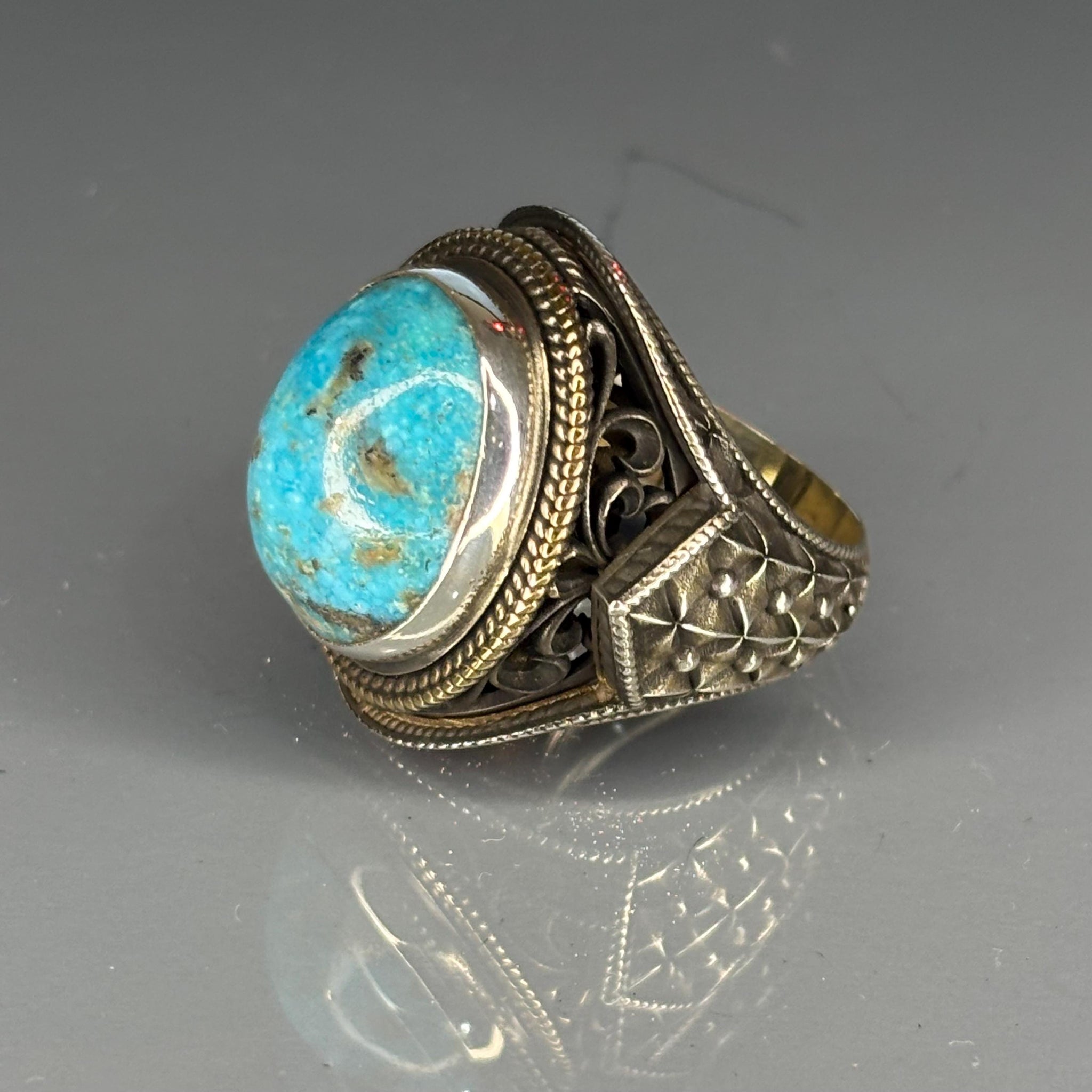 This striking two-tone ring features a magnificent Blue Turquoise stone, masterfully set in 925 sterling silver. Showcasing a bold Ottoman Engraved design on the shoulders and a detailed bronze bezel, this piece is a testament to masterful artisan craftsmanship and historical grandeur.
