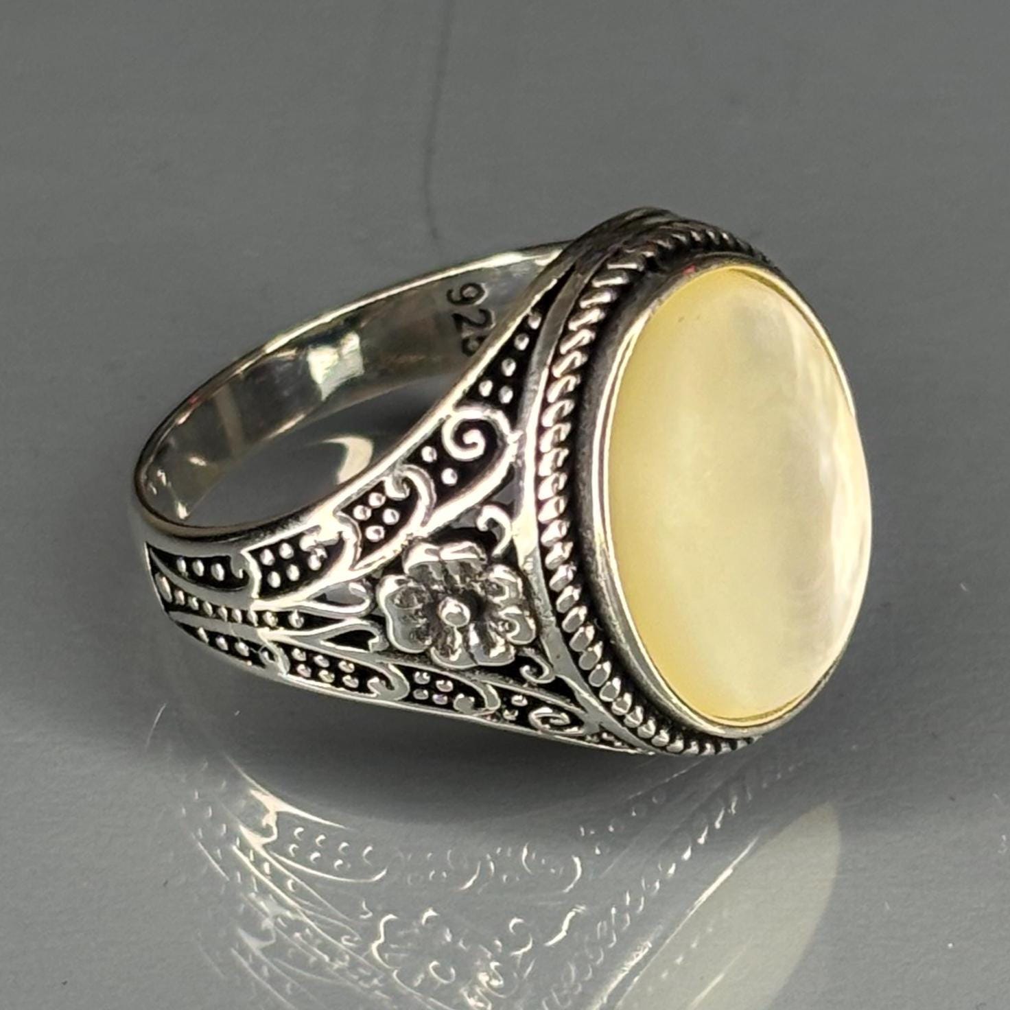 Sterling Silver Mother of Pearl Ring, Artisan Filigree Band, Vintage Style