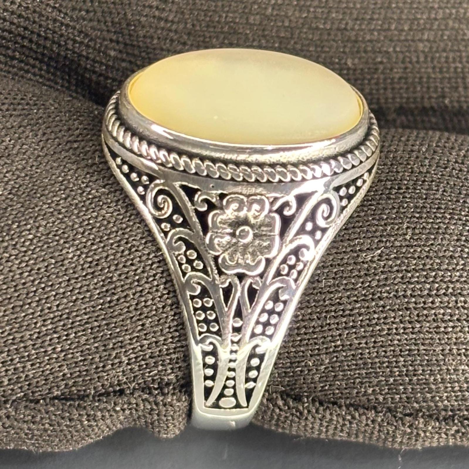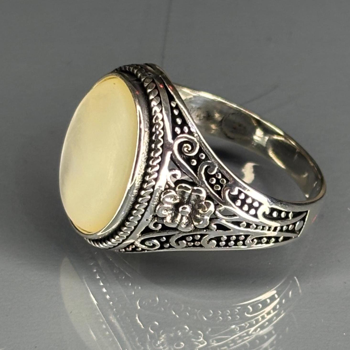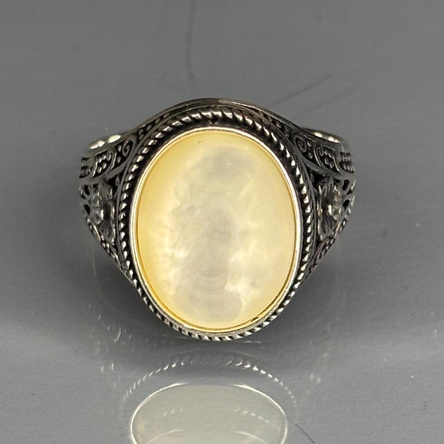 This striking 925 sterling silver ring showcases a luminous, genuine Mother of Pearl centerpiece. The beautiful cabochon is framed by a twisted rope border, while the band features intricate, handcrafted filigree details with subtle bronze accents. This piece is a piece that embodies timeless elegance and masterful artisan craftsmanship.