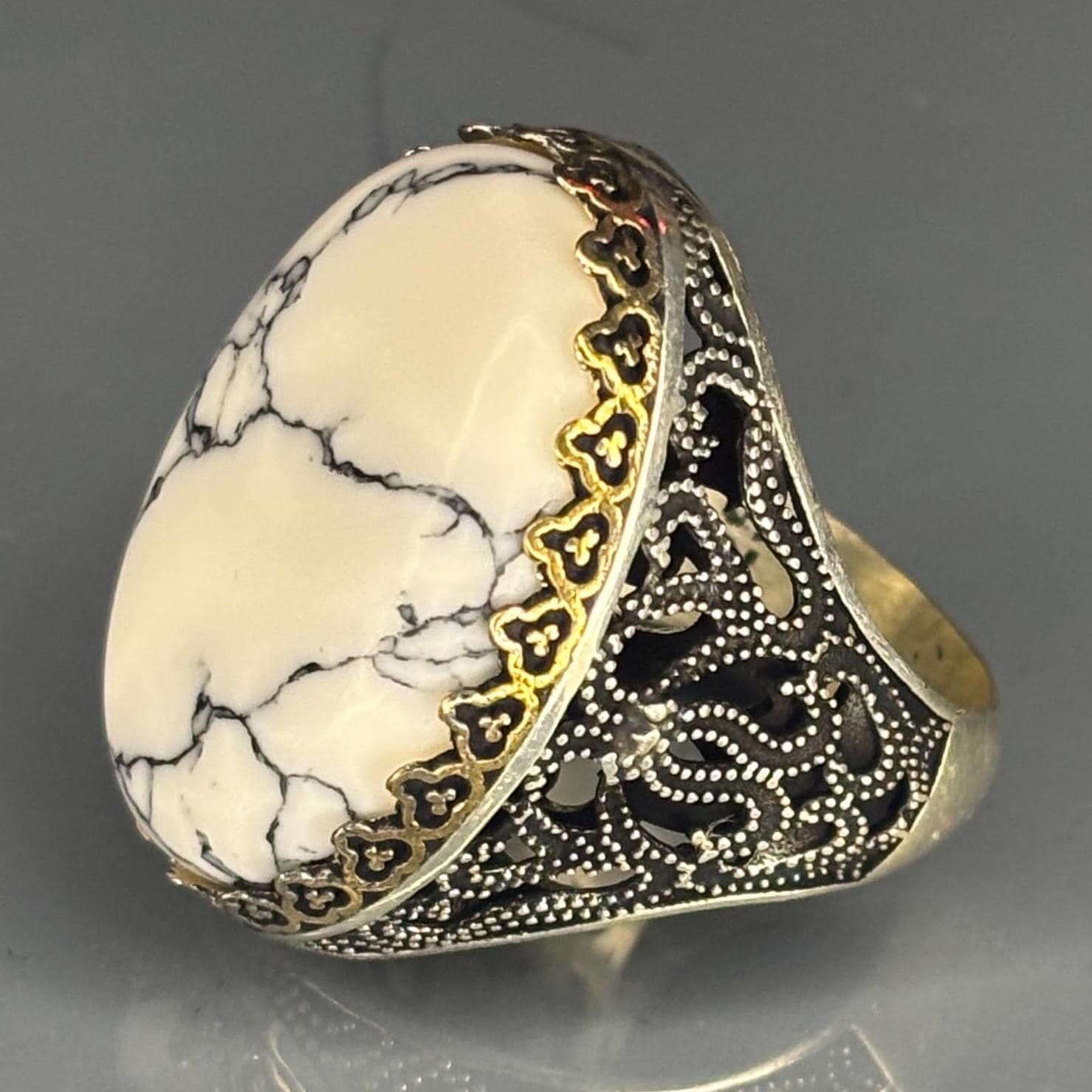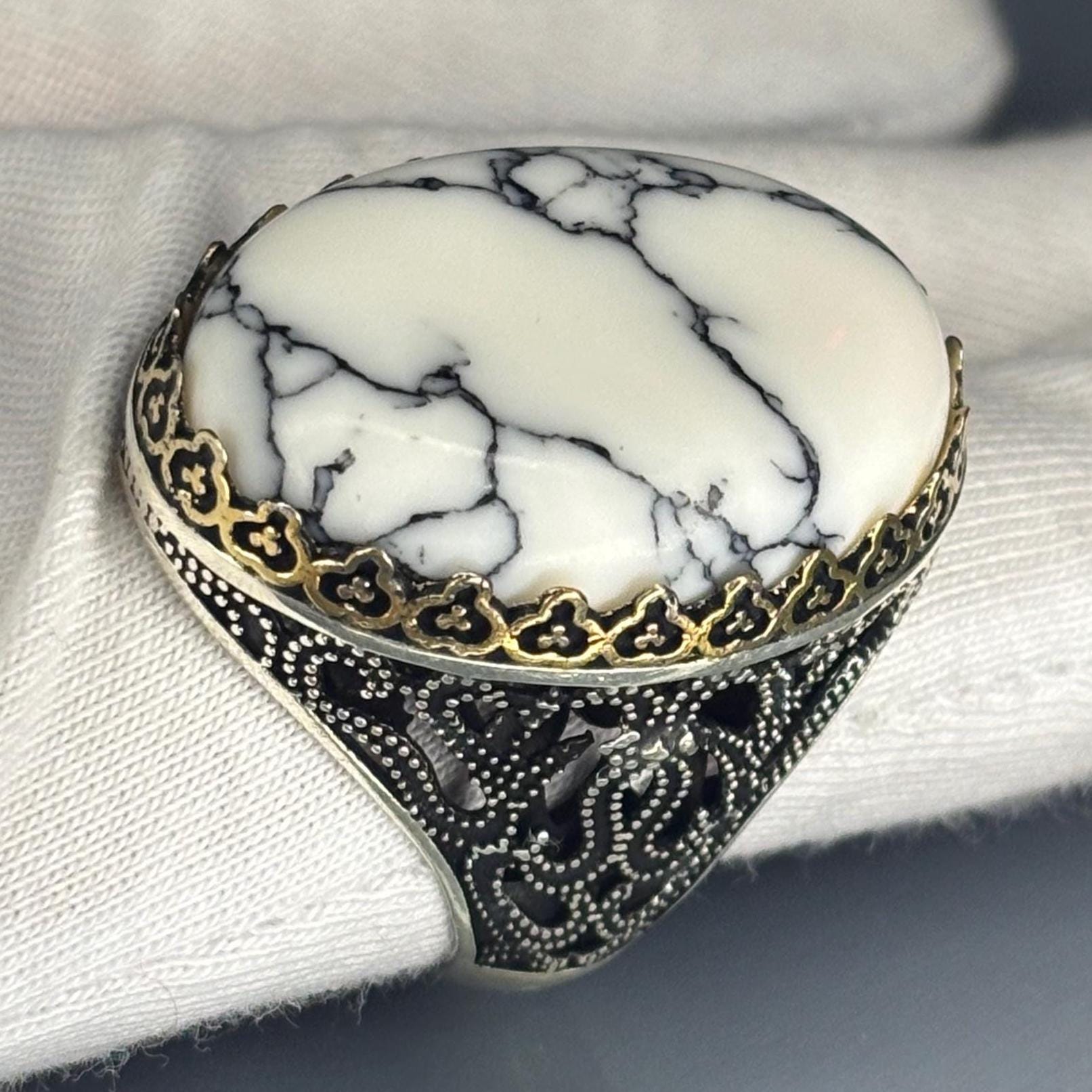 This striking 925 Sterling Silver ring is a true masterpiece, a testament to masterful artisan craftsmanship that embodies a unique and spiritual aesthetic. It commands attention with its magnificent White Turquoise main stone, featuring distinctive black veining that adds to its natural allure. The ring boasts intricate filigree details throughout its design, showcasing a bold, ornate aesthetic that speaks of rich cultural heritage and timeless elegance. This extraordinary piece is not merely jewelry; it's a wearable symbol of personal expression and distinction, designed for those who appreciate unique, handcrafted artistry.