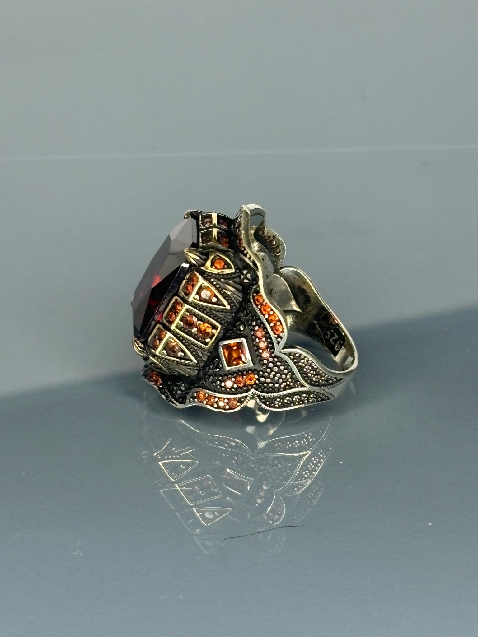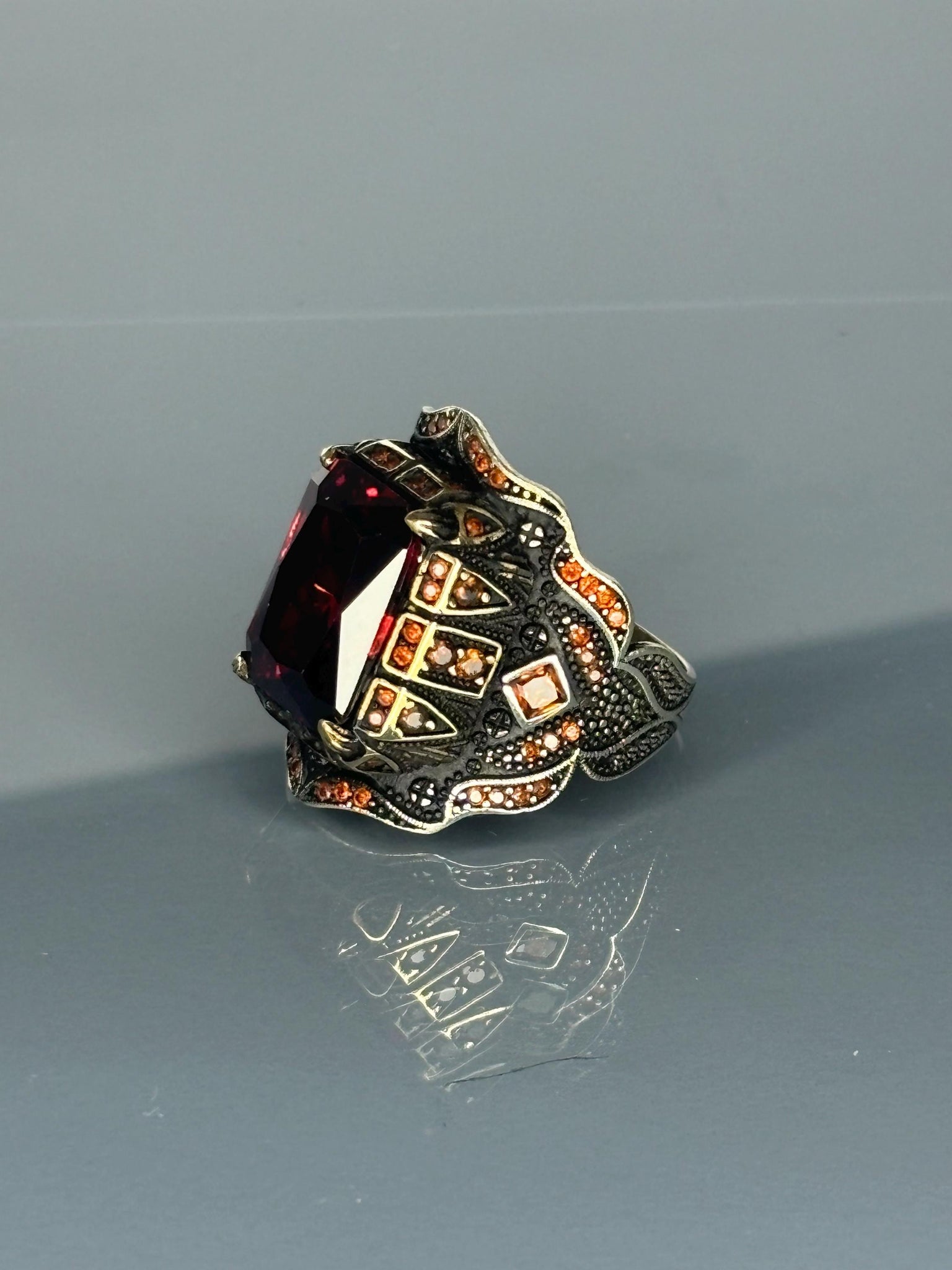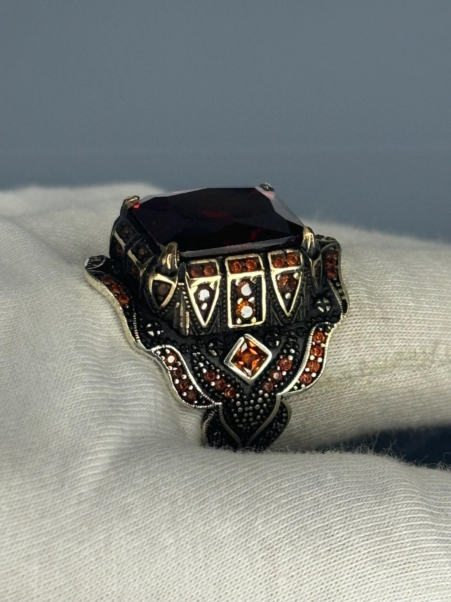 925 Sterling Silver Men's Ring: Ruby Red Gothic Statement