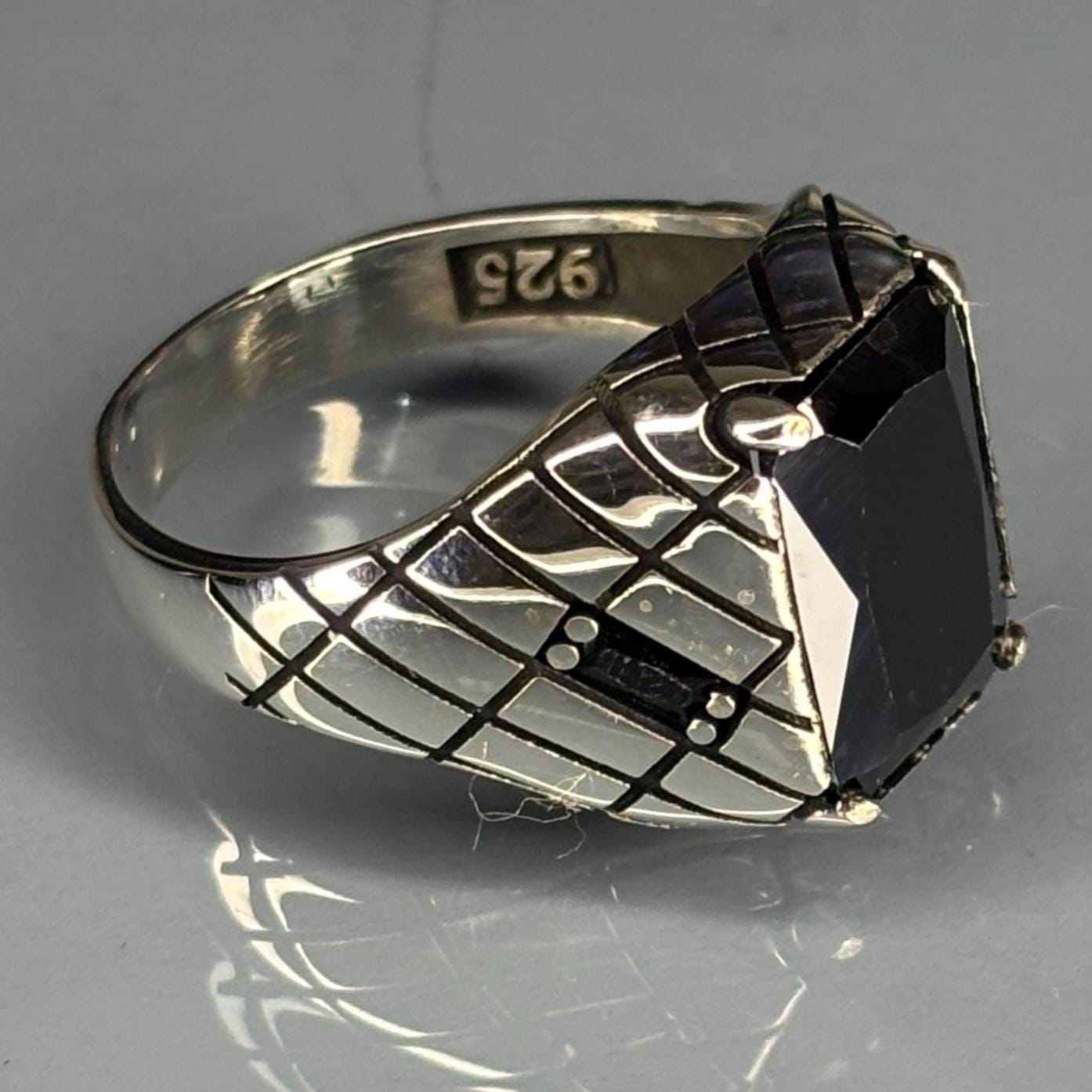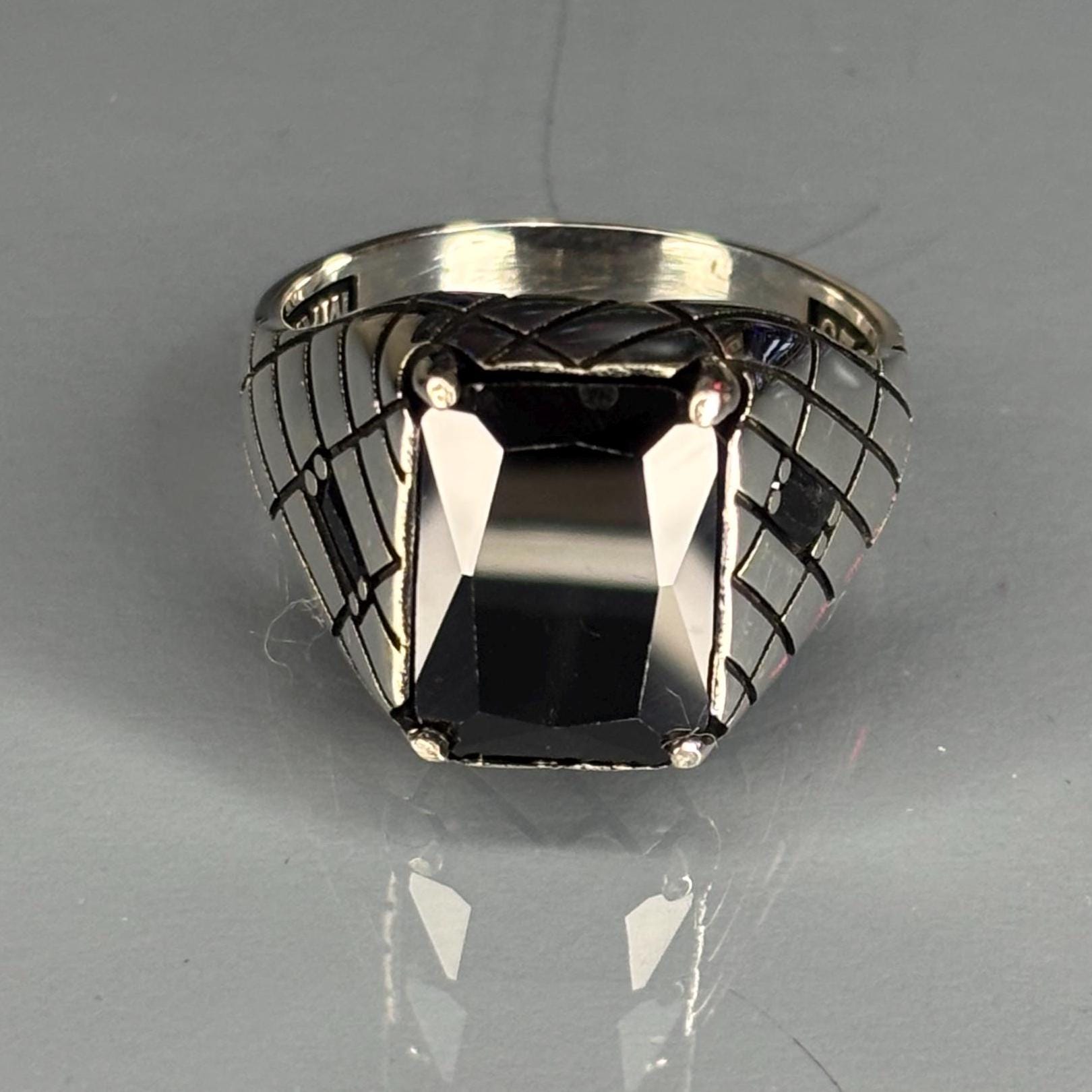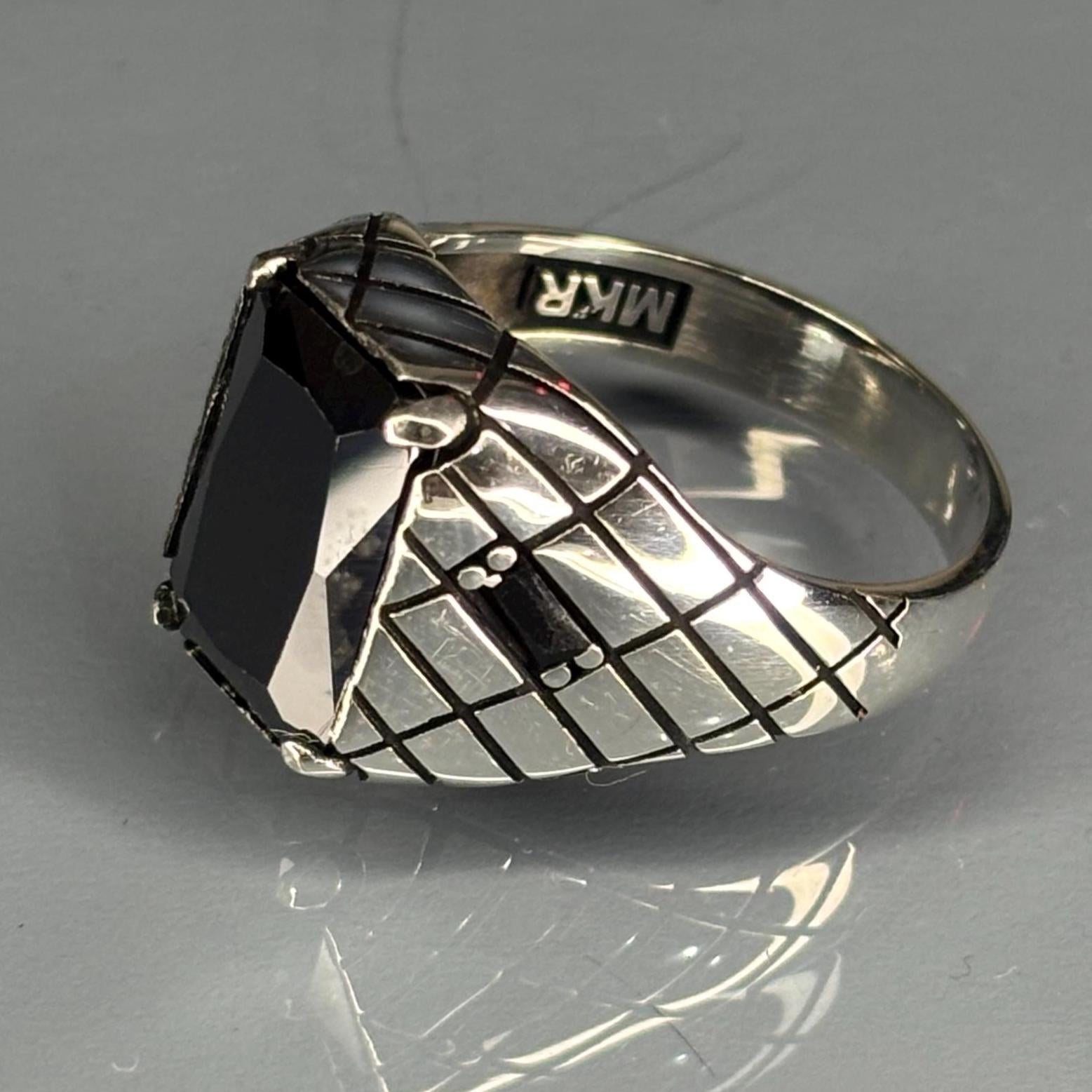 This striking 925 sterling silver ring features a magnificent, faceted emerald-cut Black Onyx stone. The classic signet style is enhanced with a sophisticated geometric cross-hatch pattern on the shoulders, inspired by the Art Deco era. This piece blends timeless elegance with sharp, modern design.