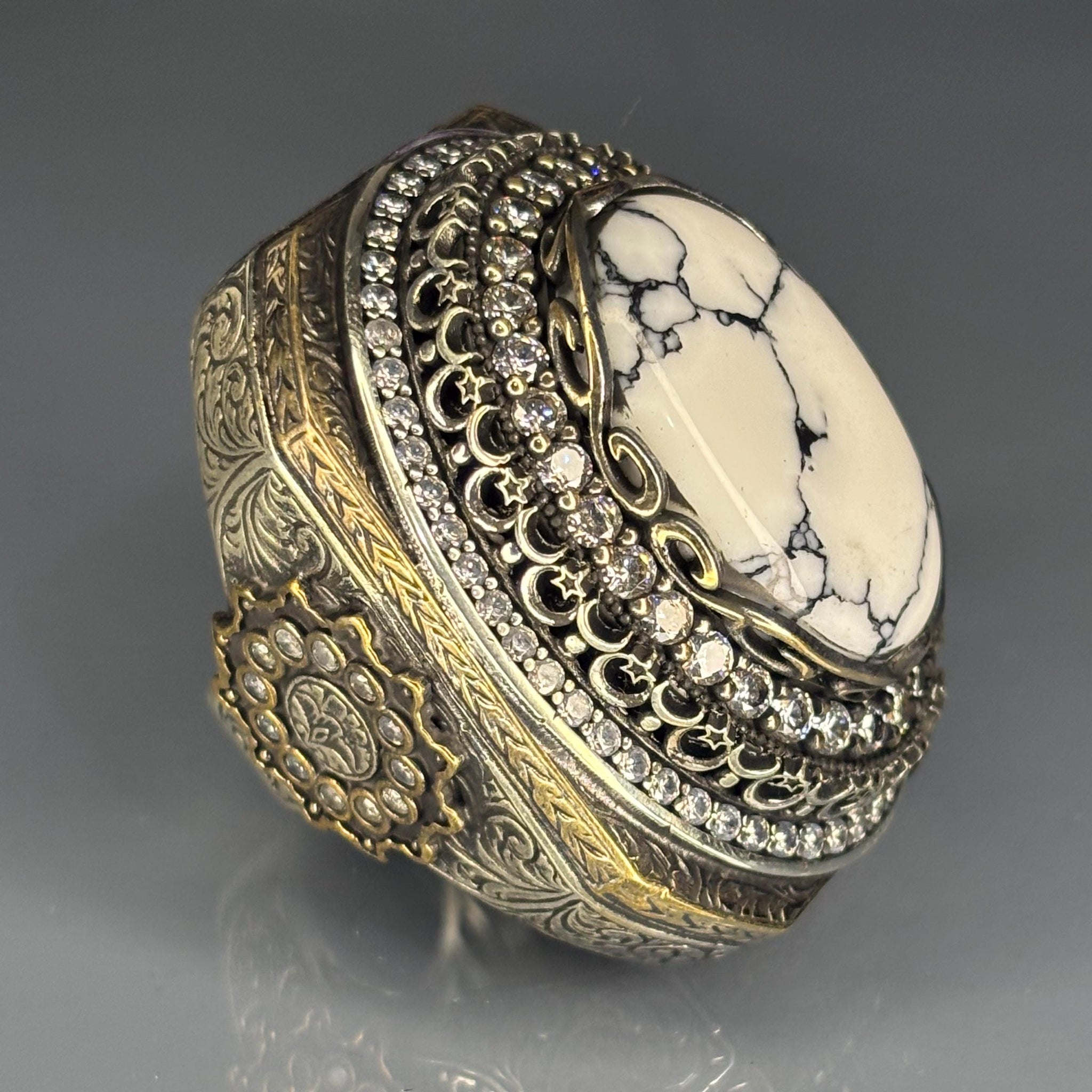 This magnificent men’s ring is handcrafted from solid 925 sterling silver and features a large oval White Turquoise gemstone framed by a dazzling halo of brilliant Moissanite stones. The bold Ottoman engraved design, accented with warm bronze details, captures the grandeur of imperial artistry and masterful metalwork, making it a statement piece of timeless elegance.