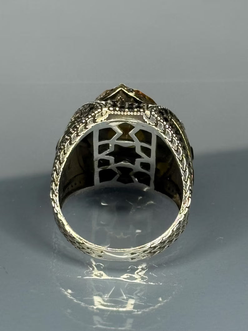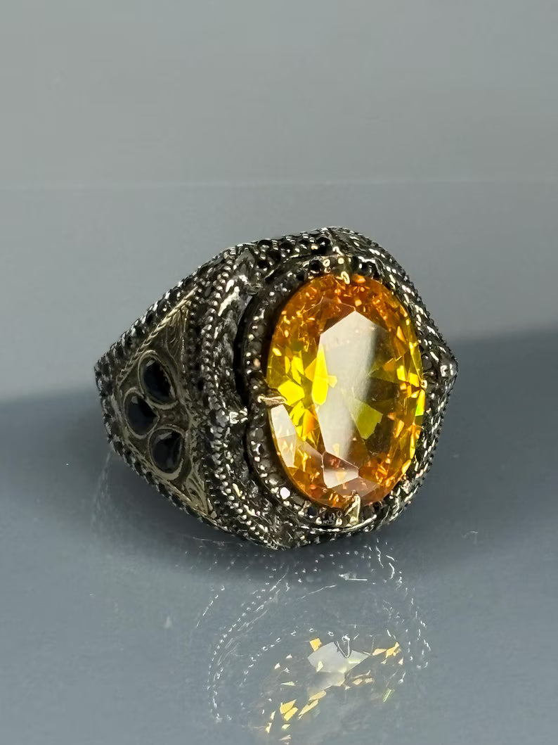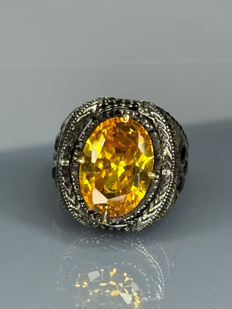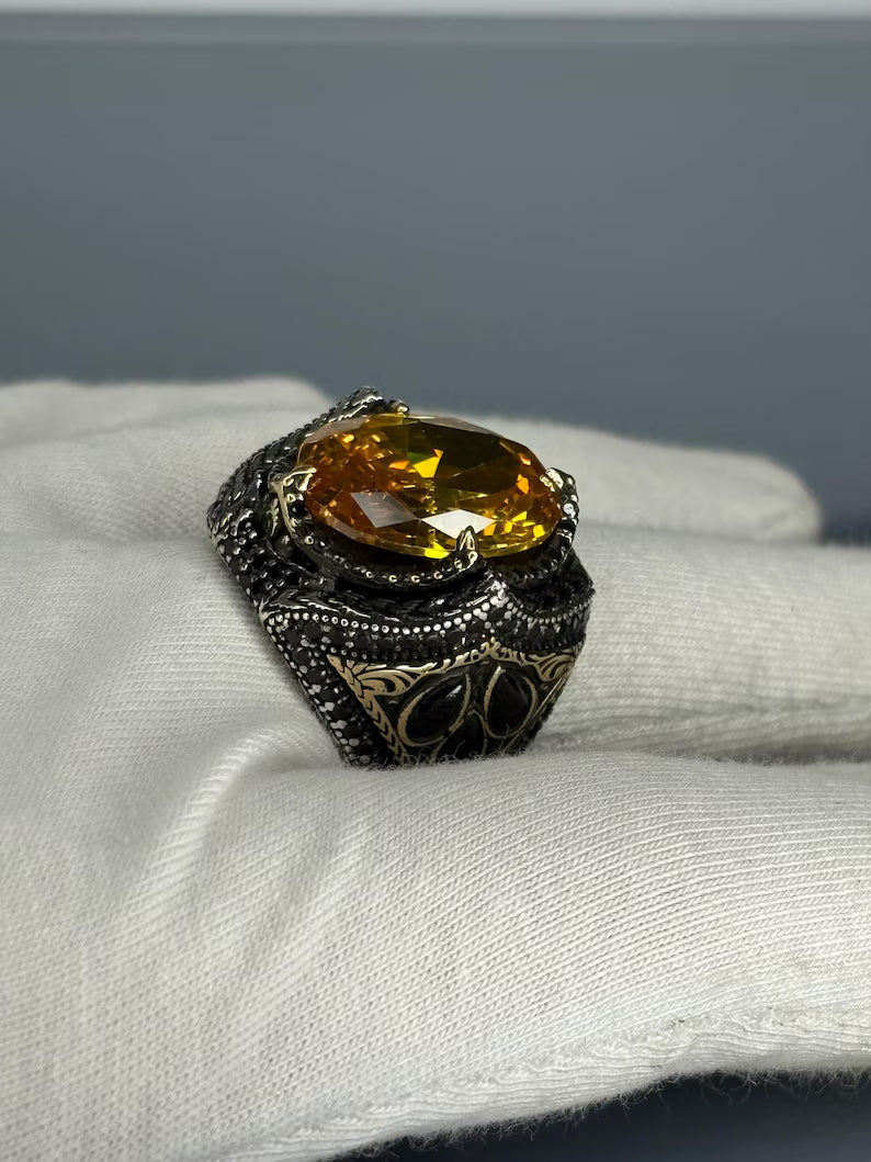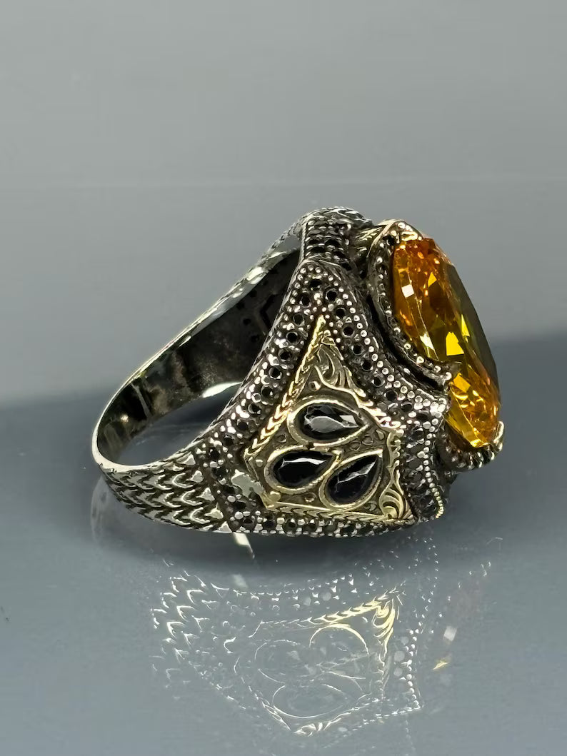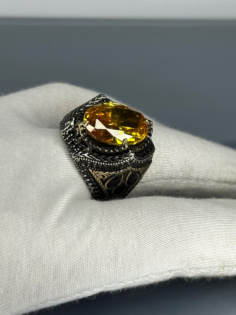 Handmade 925 Sterling Silver Men’s Citrine Ring | Vintage Ottoman Style Yellow Stone