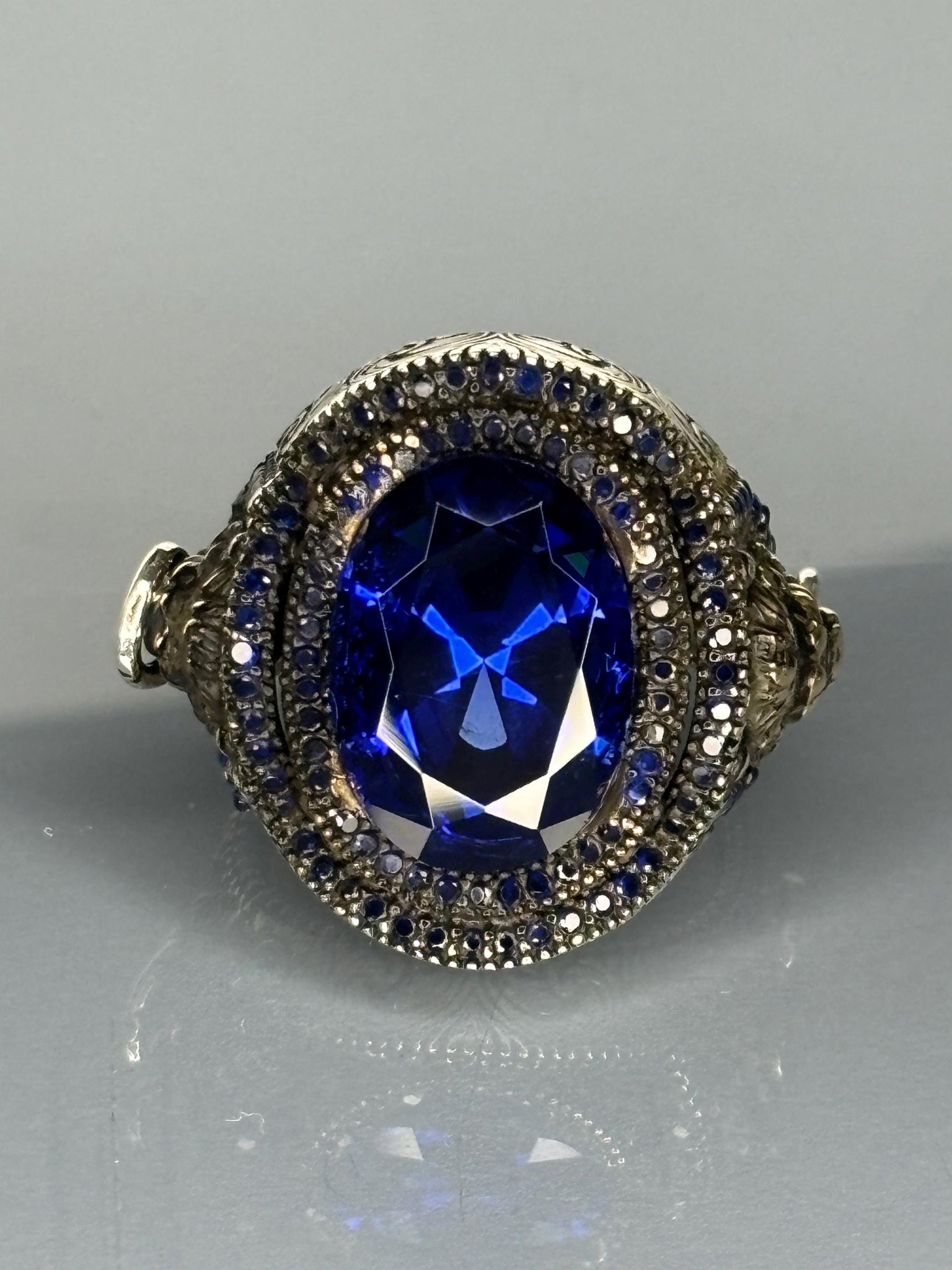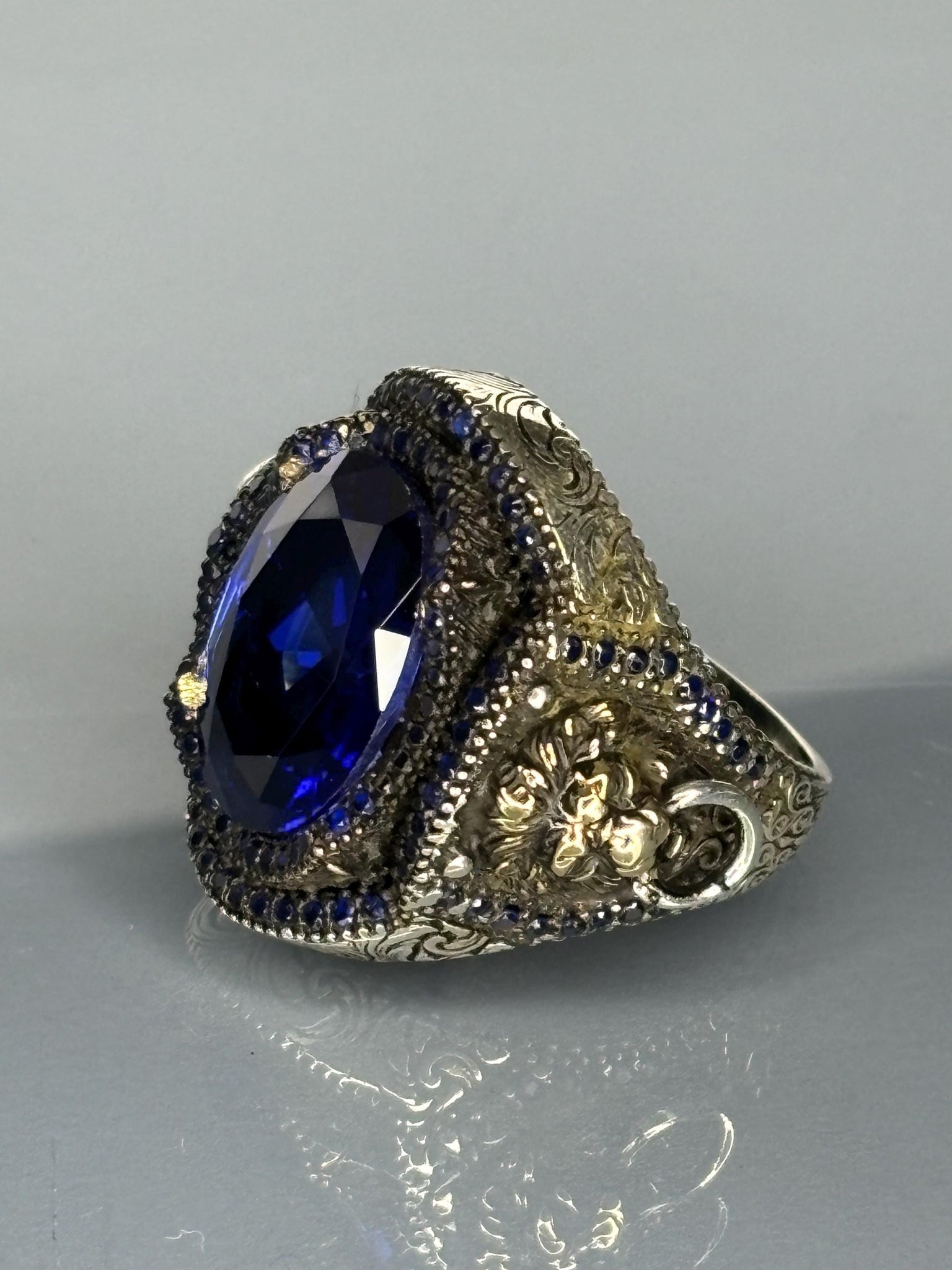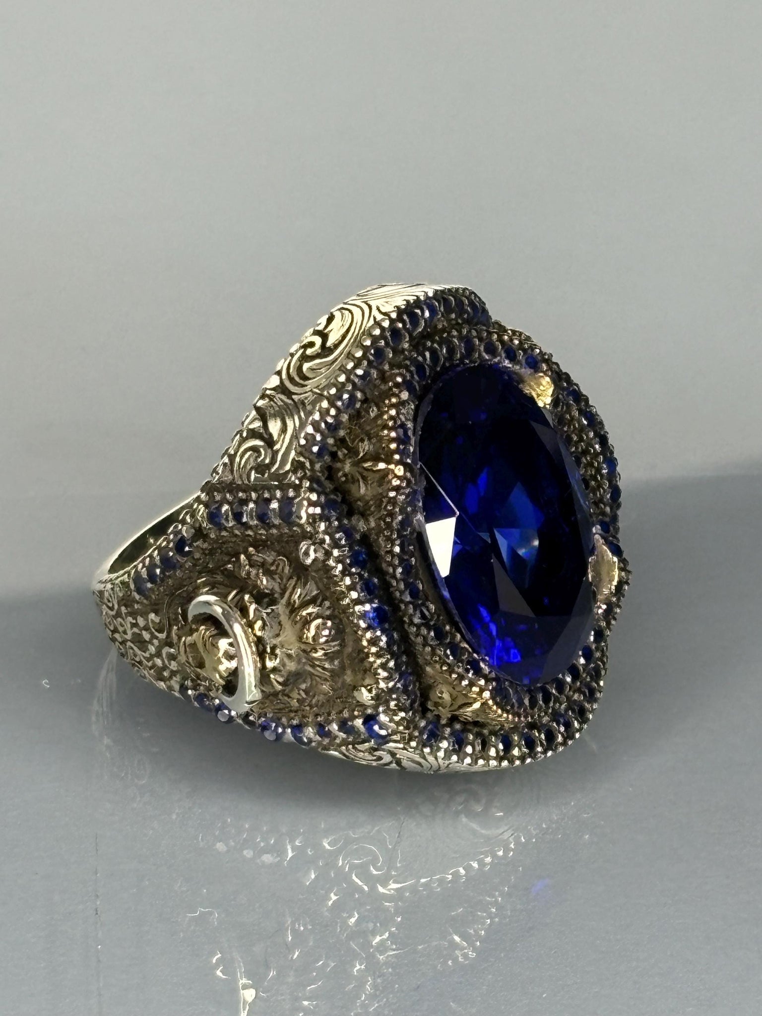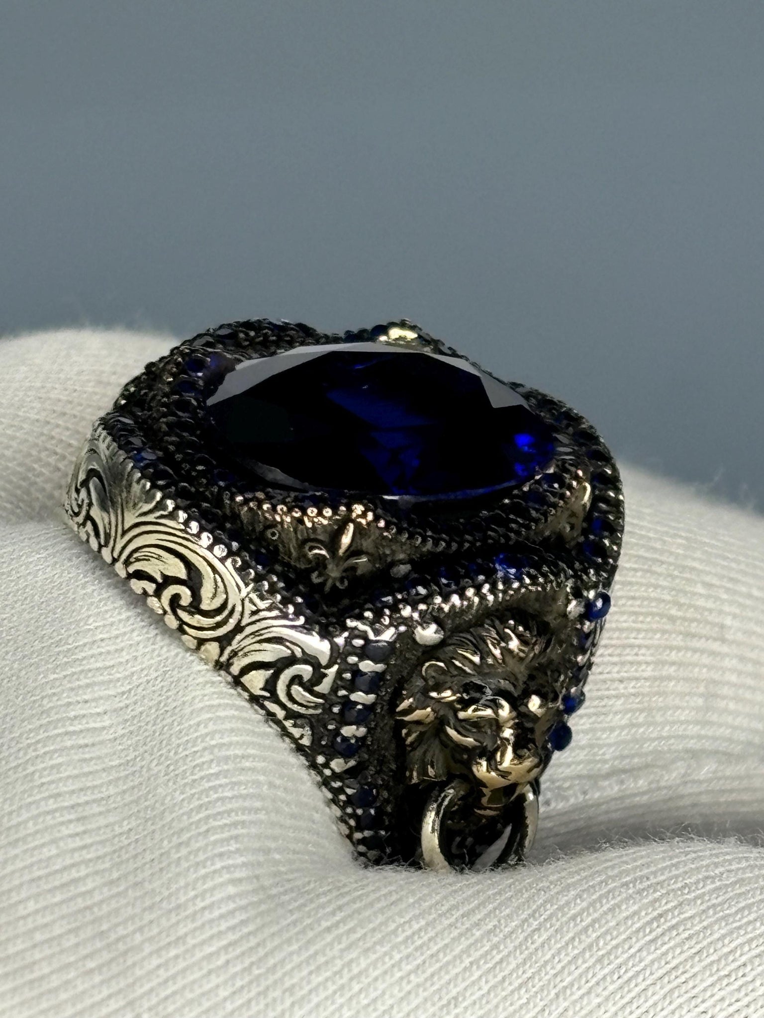 Make a bold statement with this extraordinary sapphire ring, perfect for those who appreciate unique, gothic-inspired jewelry or want to surprise a loved one with a memorable gift.